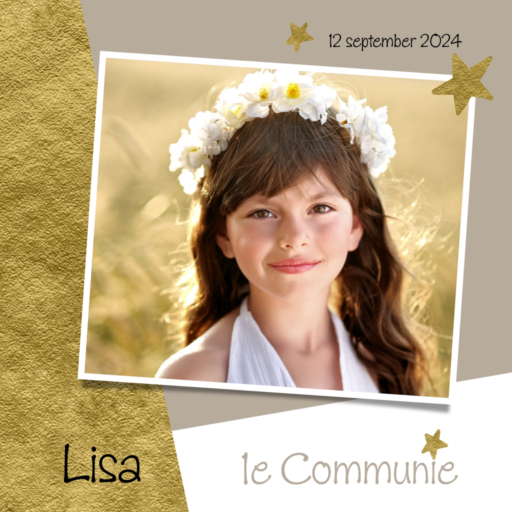 Prachtige communiekaart met eigen foto's. Te gebruiken als uitnodiging of als bedankkaart. De taupe achtergrondkleur is te veranderen. (22292)