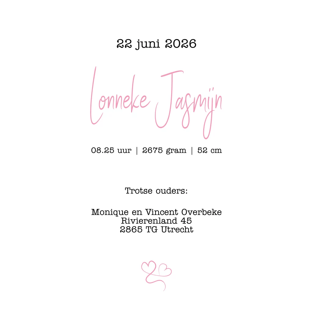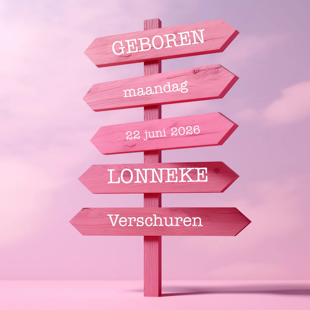 Schattig stoer geboortekaartje met houten wegwijzer. In roze tinten. Plaats binnenin de eerste foto van je baby. (23935)