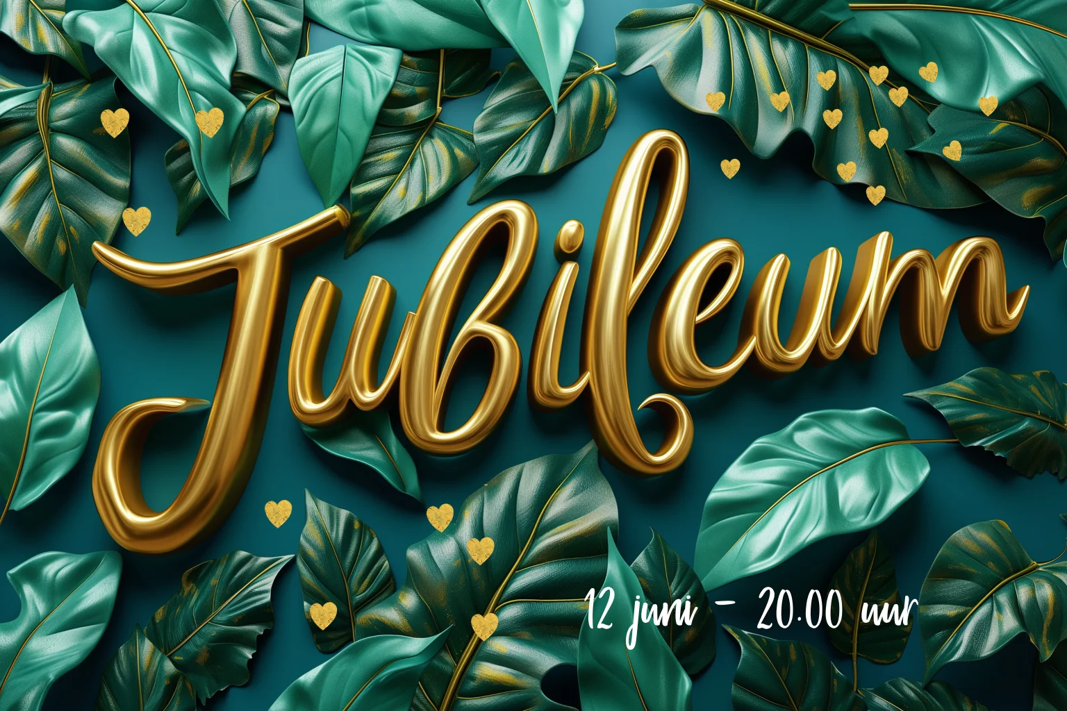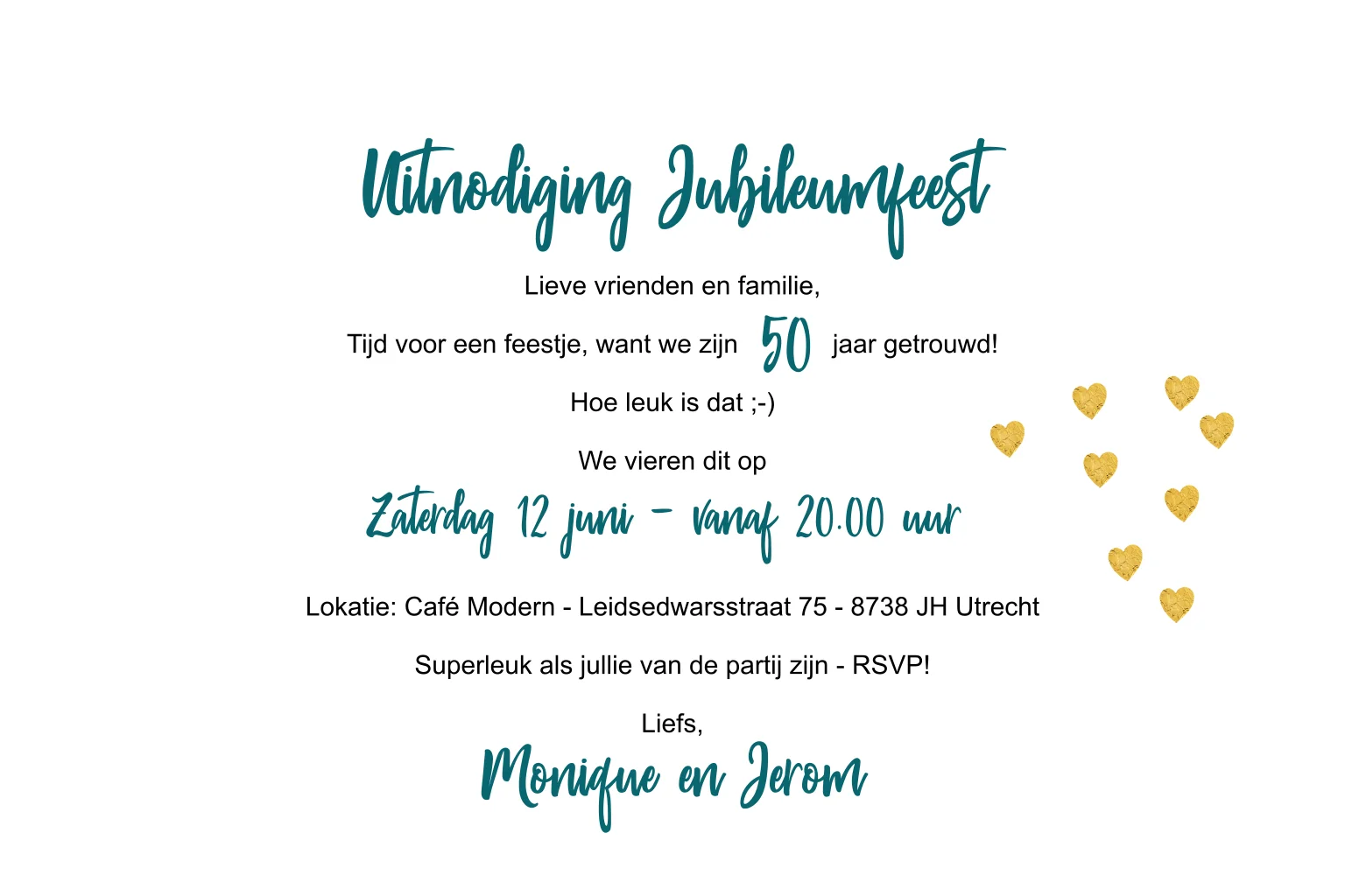Prachtige uitnodiging voor een JUBILEUM 50 jaar getrouwd met opvallende grote gouden letters, gouden hartjes confetti, botanisch blad op petrol kleur achtergrond. (23649)