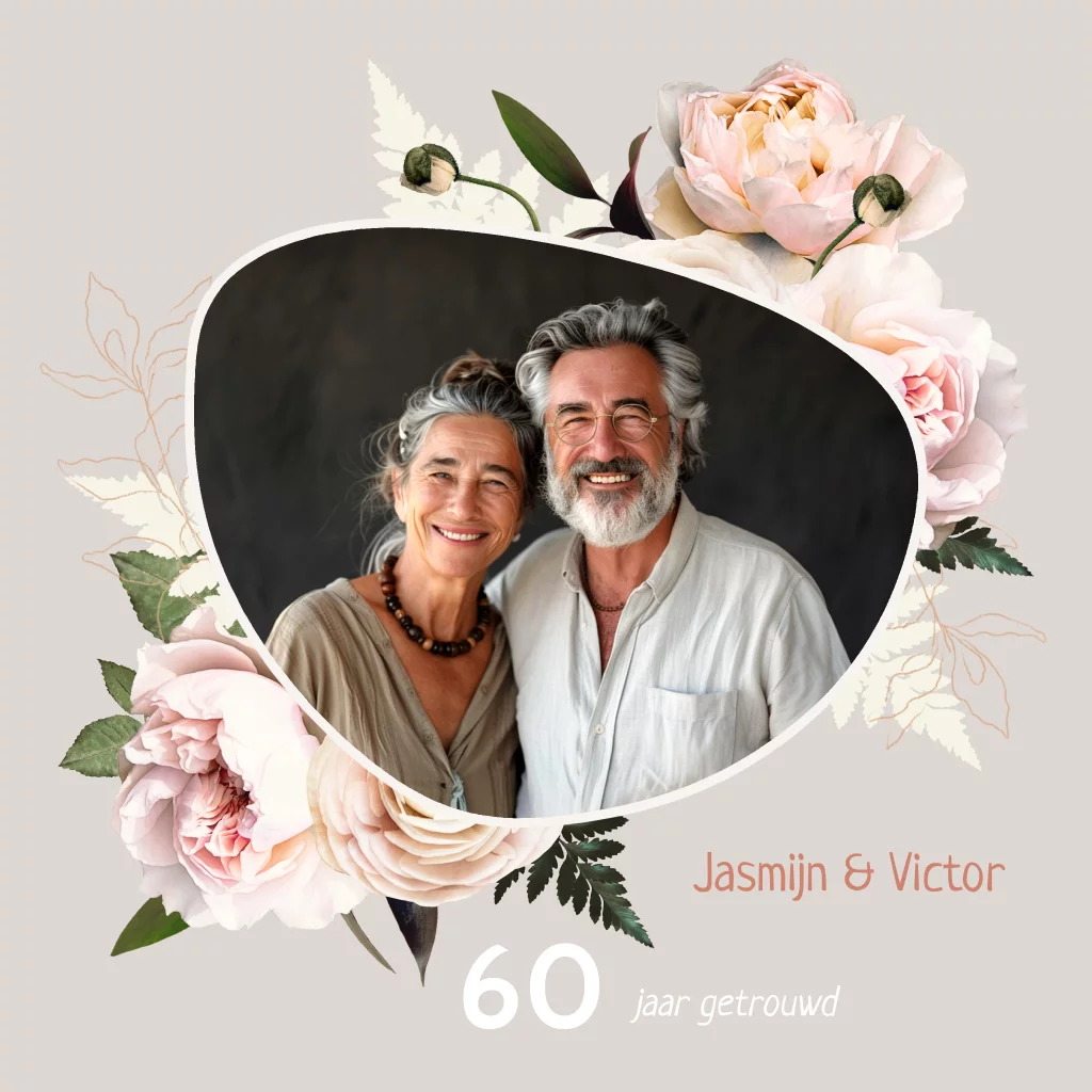 Gezellige en luxe uitnodiging voor een huwelijksjubileum 60 jaar getrouwd feestje of etentje. Licht taupe /grijze achtergrond kleur met mooi roze rozen. Met een leuk fotokader waar je makkelijk jullie foto in zet. (23702)