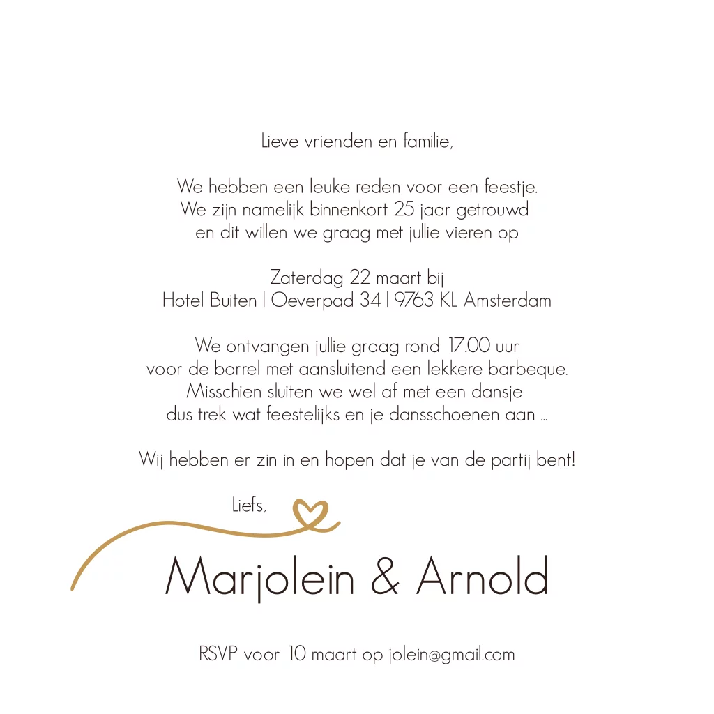 Prachtige uitnodiging 25 jarig huwelijk. In Art Deco stijl. Met tekst voorzijde in goudfolie print. Heel chique. (23238)