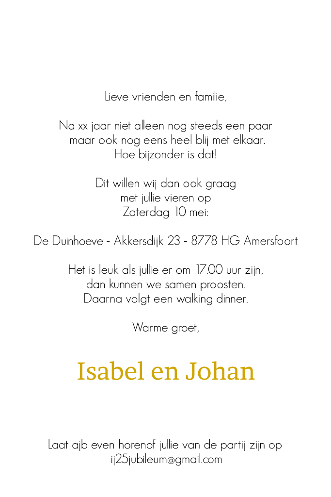 Stijlvolle uitnodiging voor je huwelijksjubileum. Met prachtige foto van champagne die ingeschonken wordt. De tekst is te wijzigen en binnen kun je een romantische foto plaatsen. (22011)