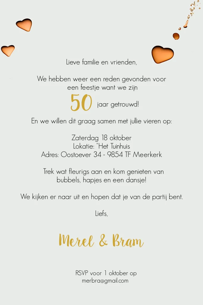 Jubileum uitnodigingskaart 50 jaar getrouwd met proostende champagne glazen en bruisende hartjes. Makkelijk te maken en erg mooi. Binnen ook ruimte voor je eigen foto. (24084)