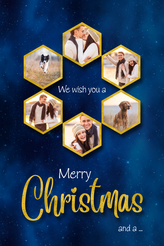 Prachtige foto-collage kaart met hippe hexagon fotoframes. Let goed op dat je foto goed past. Merry Christmas & Happy New Year (op de achterzijde). (21453)