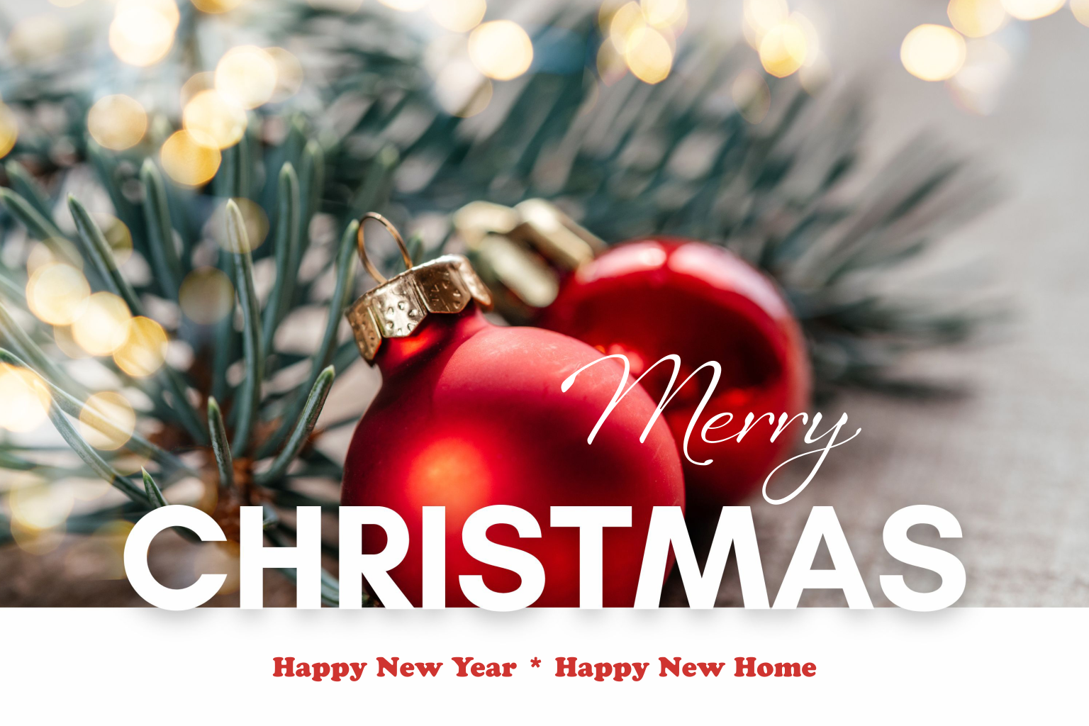 Drie in 1. Deze kerst, nieuwjaars verhuiskaart. Met rode kerstbal, kerstgroen en lampjes. (23713)