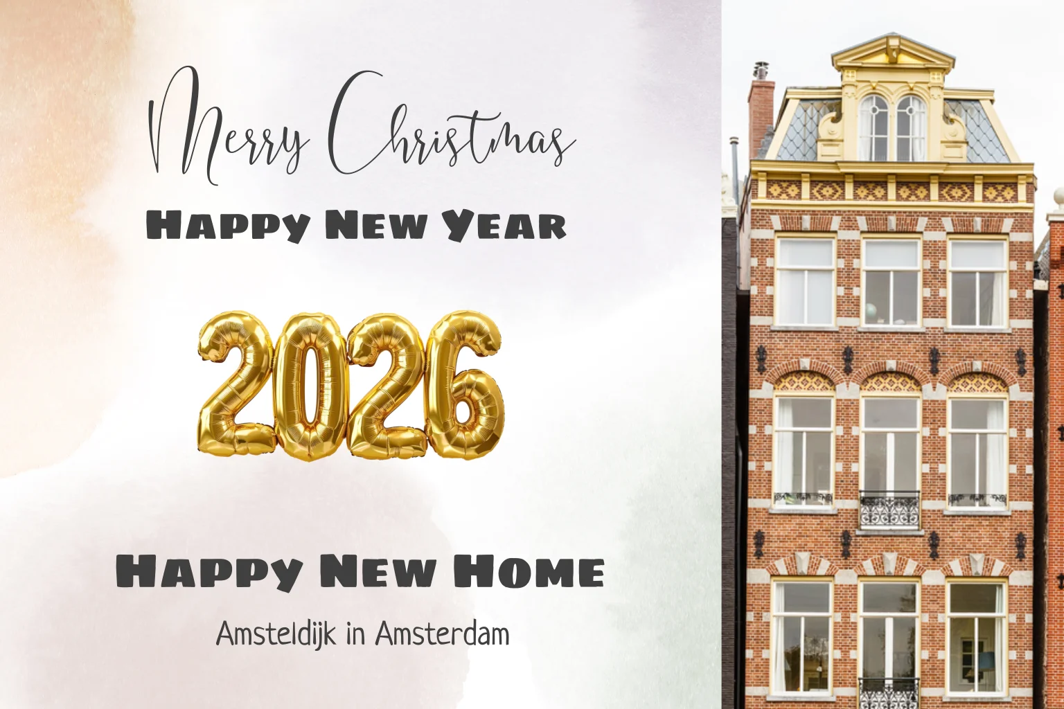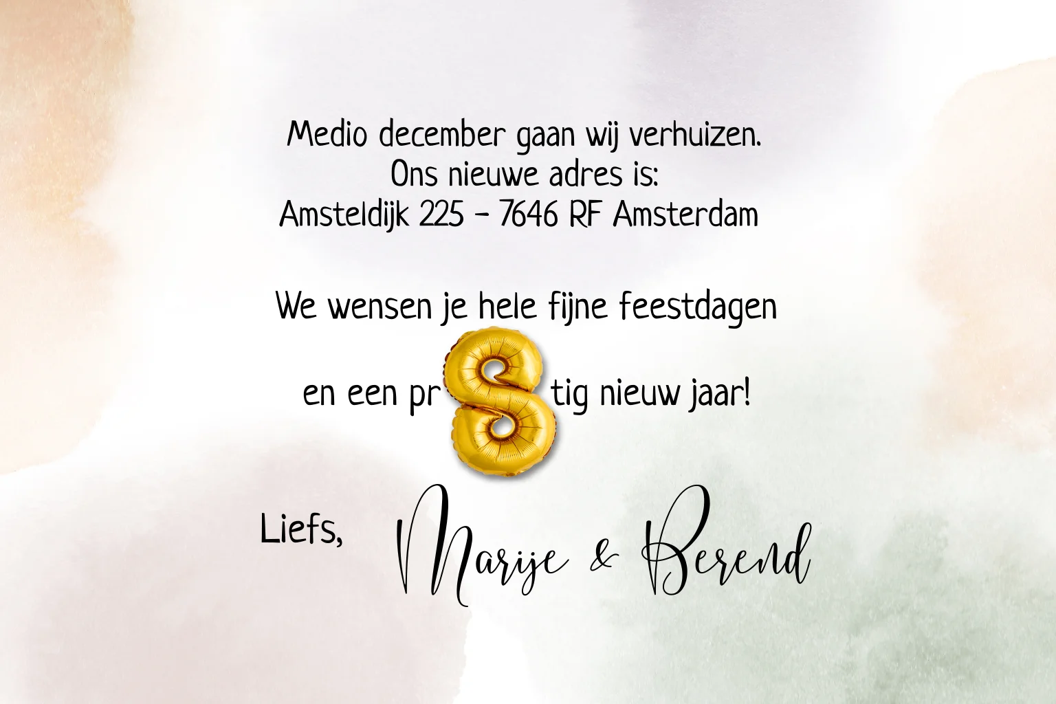 Drie in 1. Kerst - Nieuwjaars - Verhuiskaart. Met waterverf achtergrond, ruimte voor je eigen foto en goudkleurige ballonnen. Vrolijk en compleet. (21533)