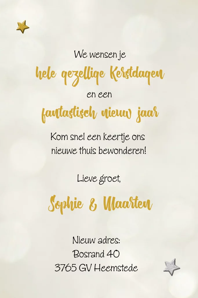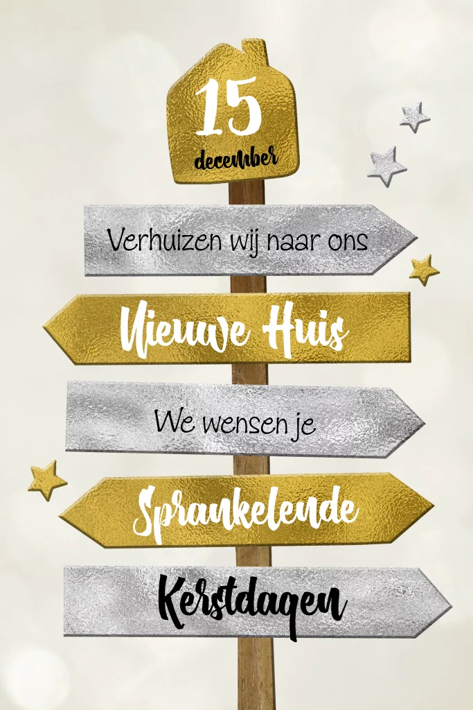 Kerst Verhuiskaart met een wegwijzer met goud en zilverkleurige bordjes, een huisje en sterren. Alle teksten zijn te veranderen en binnen is ruimte voor een foto van je nieuwe huis. (21446)