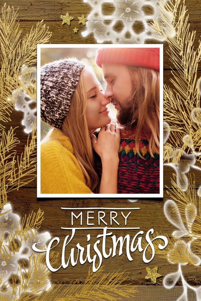 Stoere en trendy kerstkaart met je eigen foto voorop. Houtprint met goudkleurige sterren, dennentakken en uitgespoten sterren. Makkelijk te maken en supermooi. (21495)