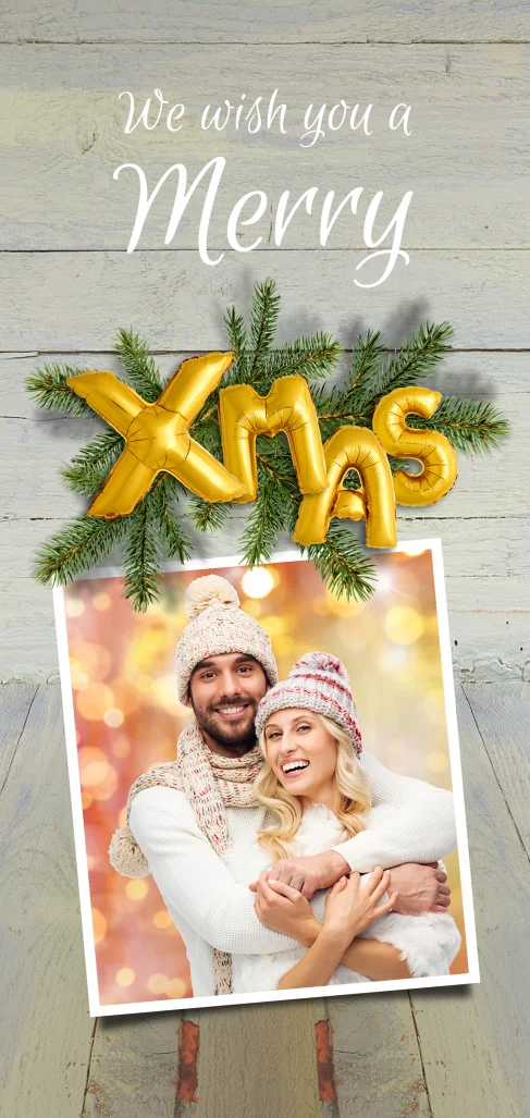 Kerstkaart foto op hout met kerstgroen en ballonnen XMAS