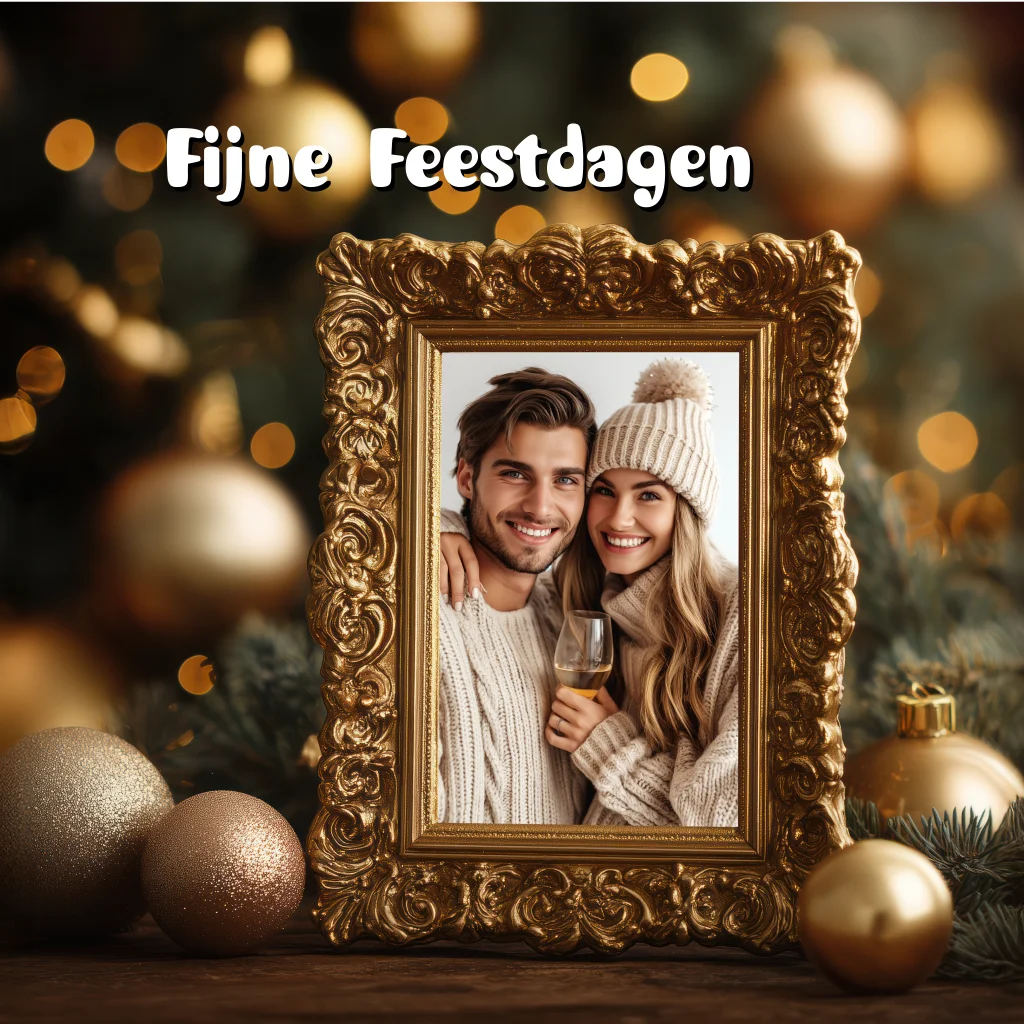 Prachtige en sfeervolle kerstkaart met een gouden fotolijst waar je foto in kan komen te staan. Met kerstballen, kerstgroen en mooie lichtjes. (30205)