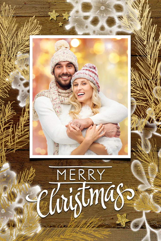 Kerstkaart hout en goudlook fotokader Merry Christmas