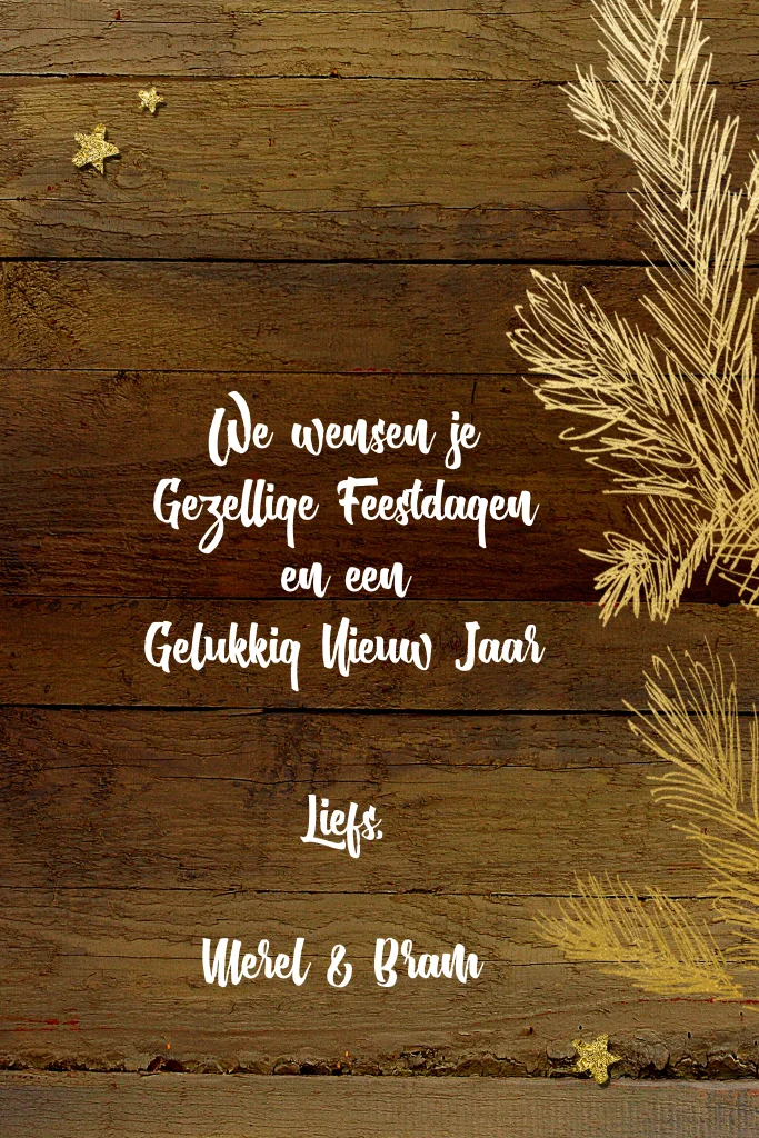 Leuke kerstkaart met je eigen portret voorop. Vervang de foto en de namen binnenin. Achtergrond van donker hout, goudkleurige sterren en dennentakken en sneeuwkristallen. (21496)