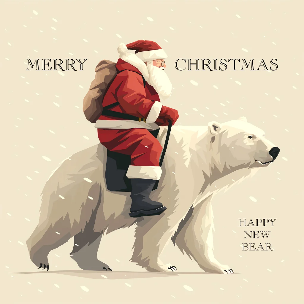 Grappige illustratieve kerstkaart met een kerstman op een ijsbeer. Merry Christmas & Happy New Bear ;-).