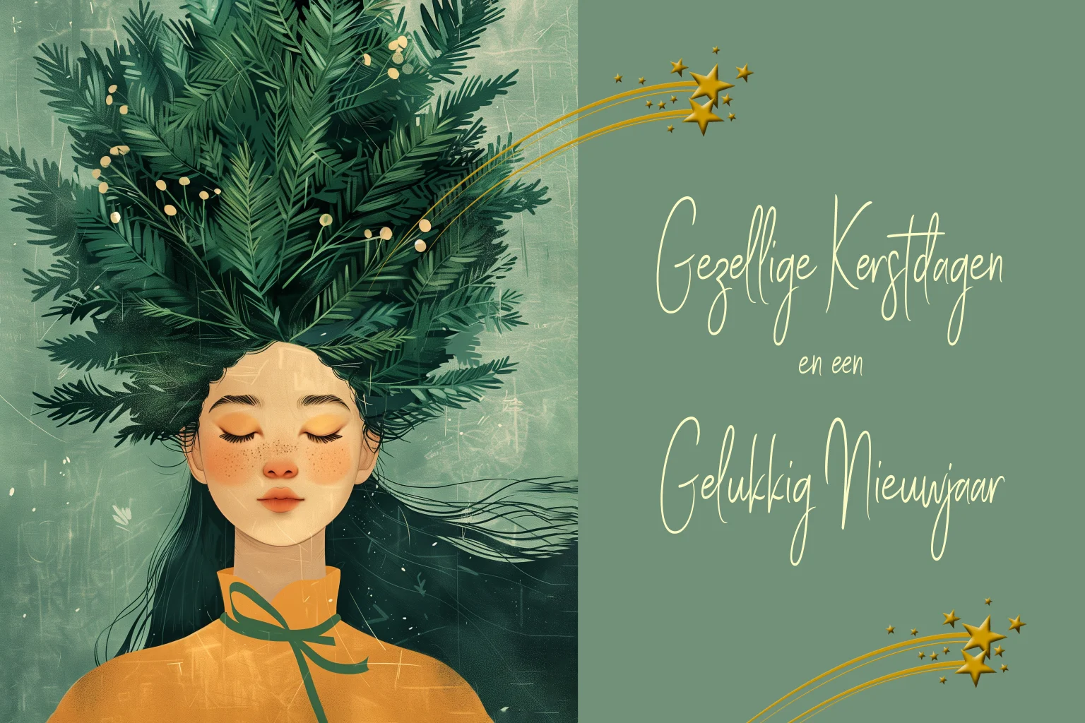 Vrolijke illustratieve kerstkaart met meisje met kerstboom-kapsel. Kan gebruikt worden door een kapper kapster. Plaats op de achterzijde je eigen portret. (30299)