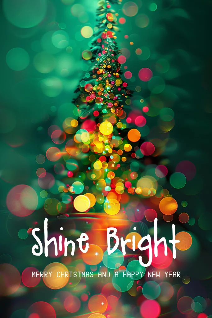 Fleurige kerstkaart met licht rondjes in felle kleuren in de vorm van een kerstboom. Plaats binnen je eigen foto. (24267)