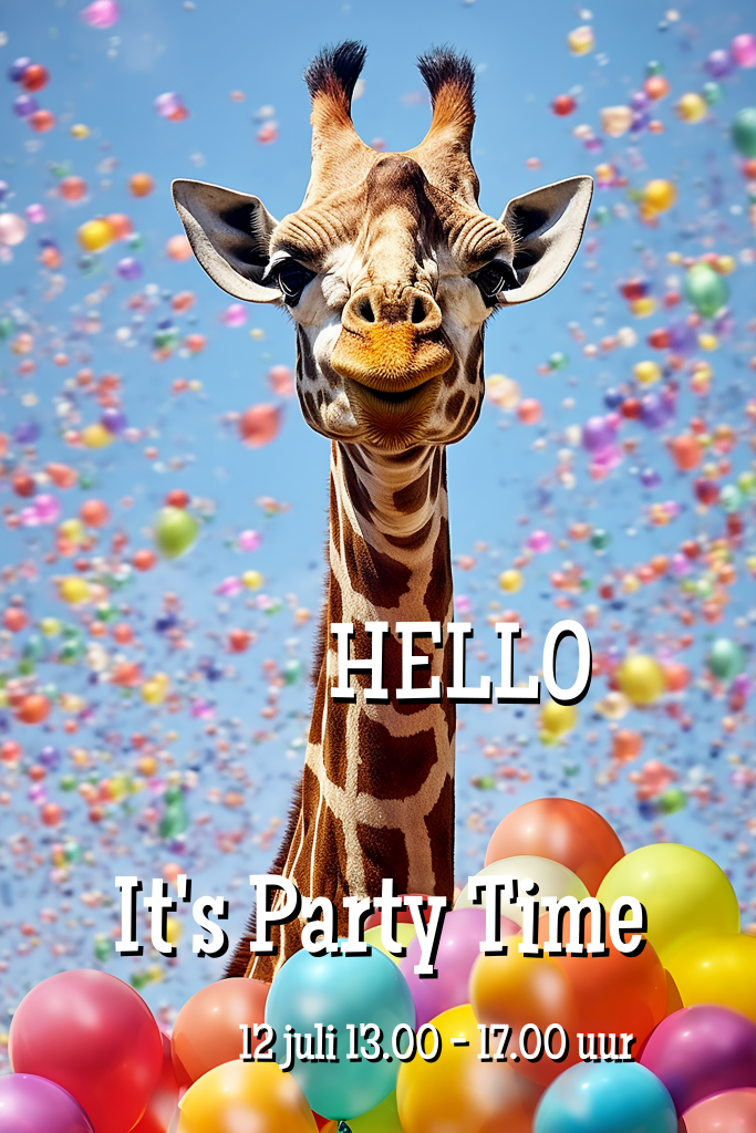 Super VROLIJKE uitnodiging met een GIRAF en heel veel ballonnen . Plaats binnenin nog een leuke foto van jezelf en pas de teksten aan. (24183)