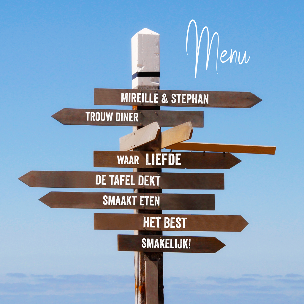 Mooie enkele menukaart met houten wegwijzer en blauwe lucht. Uit een trouwkaartenserie. (21439)