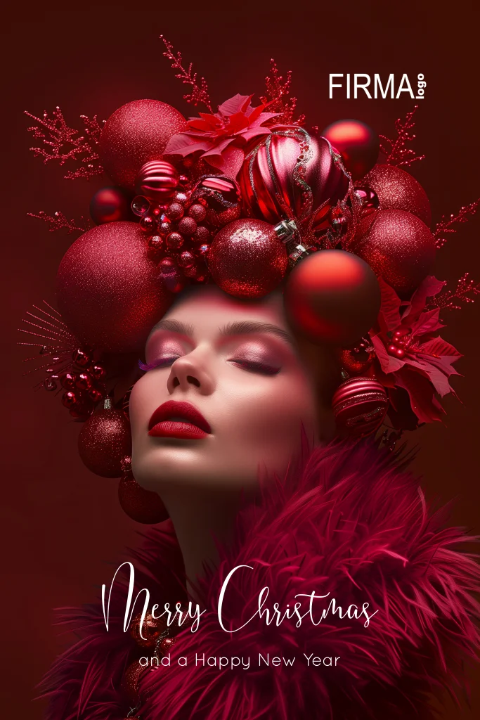 Prachtige stijlvolle en chique eigentijdse zakelijke (of niet zakelijke) kerstkaart met een model met een kerstballen kapsel. Mooie diep rode tinten (24744)