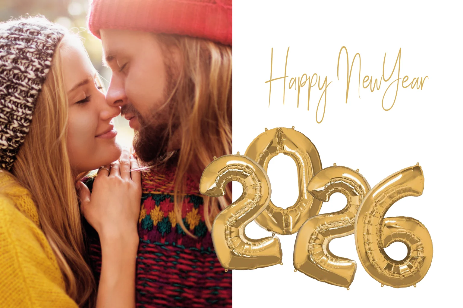 Strakke nieuwjaarskaart met goudkleurige ballonnen jaartal. Vervang de foto's en maak zo je lieve en persoonlijke kaart. (21514)