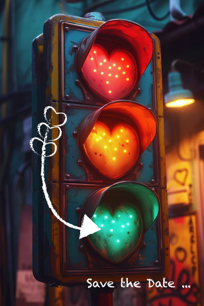 Super chille SAVE the DATE kaart met een verkeerslicht met hartjes. Een rode, oranje en groene. Jullie hebben elkaar het groene licht gegeven. Met ruimte voor een eigen foto op de achterkant van de kaart. (23644)