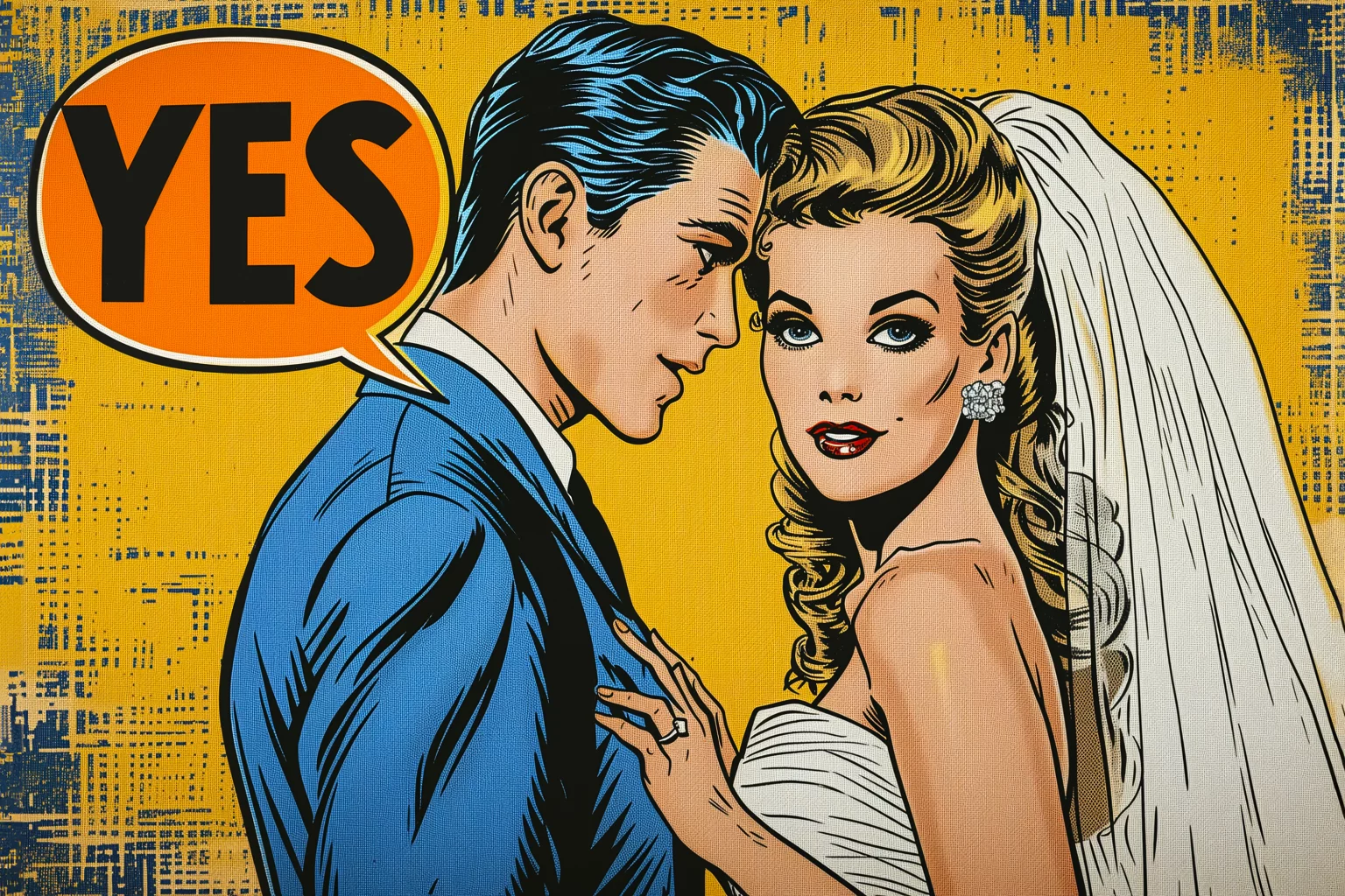 Vintage comic illustratie van een bruidspaar met tekstblok "YES". Een superleuke Save the Date kaart om alvast jullie trouwdatum door te geven. (23660)