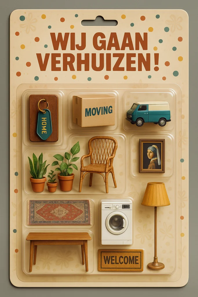 Hele hippe verhuiskaart met allemaal items die bij een verhuizing horen. De mat, de dozen, het interieur. (999999)