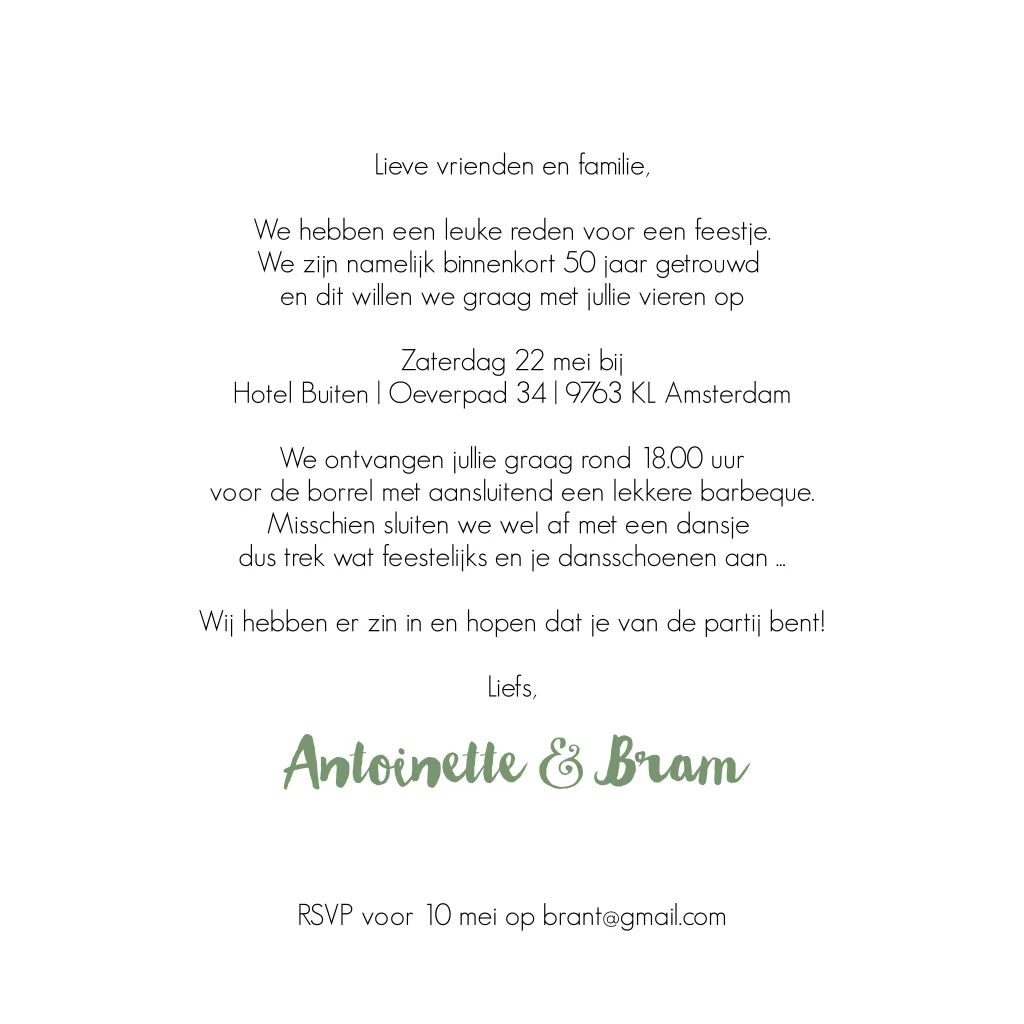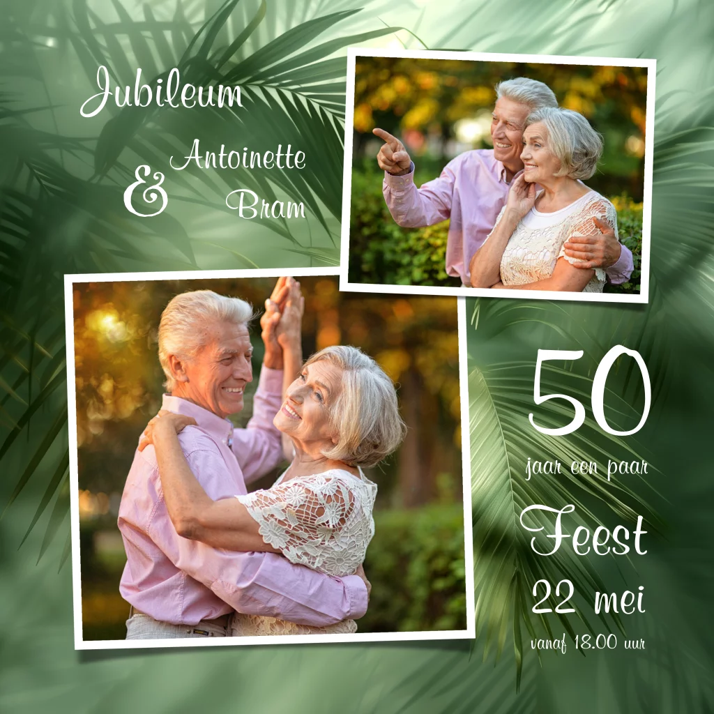 Prachtige uitnodiging 50 jaar getrouwd waar jullie eigen foto's mooi in uitkomen in tropische sferen met bladeren van een palm. (23869)