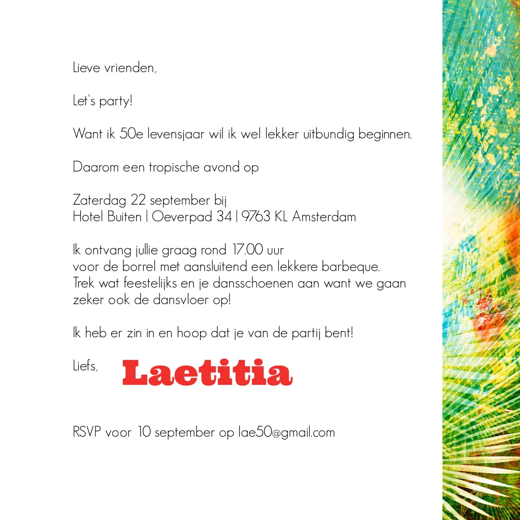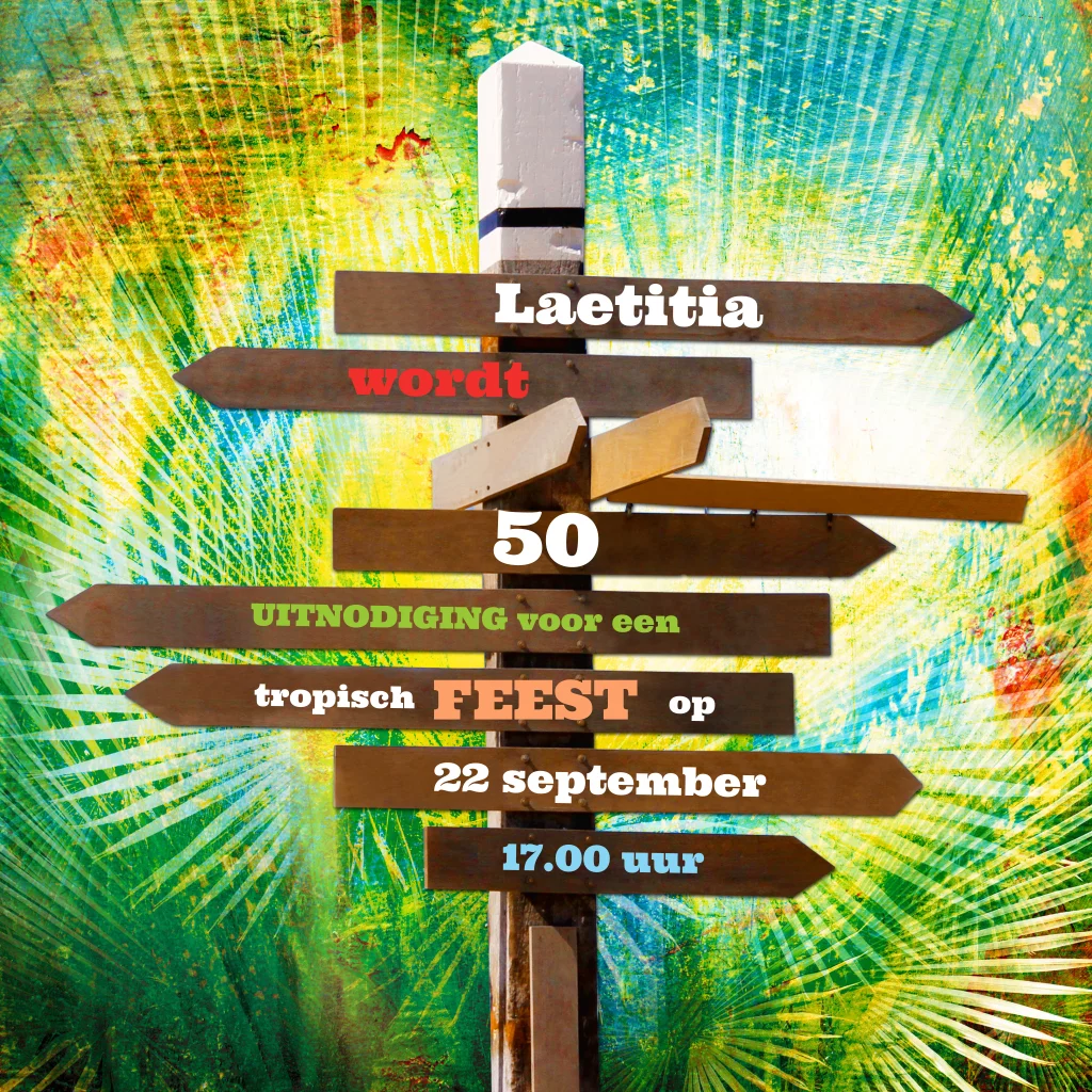50 jaar verjaardag kleurrijke uitnodiging in tropische sfeer met houten wegwijzer. (23500)