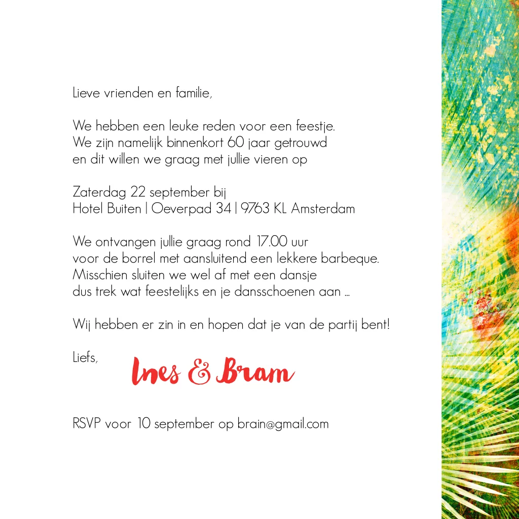 60 jaar getrouwd uitnodiging met houten wegwijzer. Tekst en kleuren zijn aan te passen en vervang binnenin de foto. (23500)