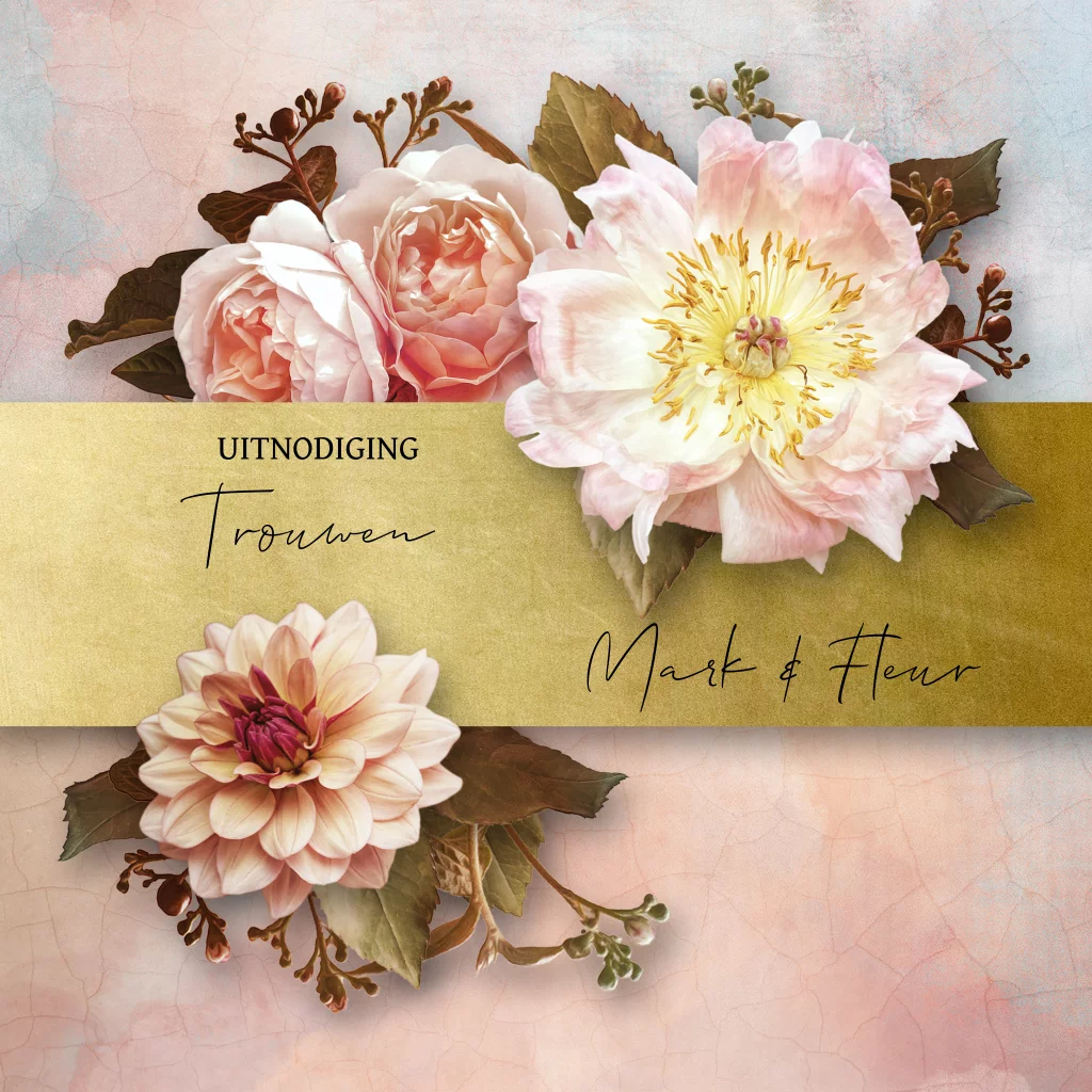 Trouwkaart met bloemen roze en goudlook accenten