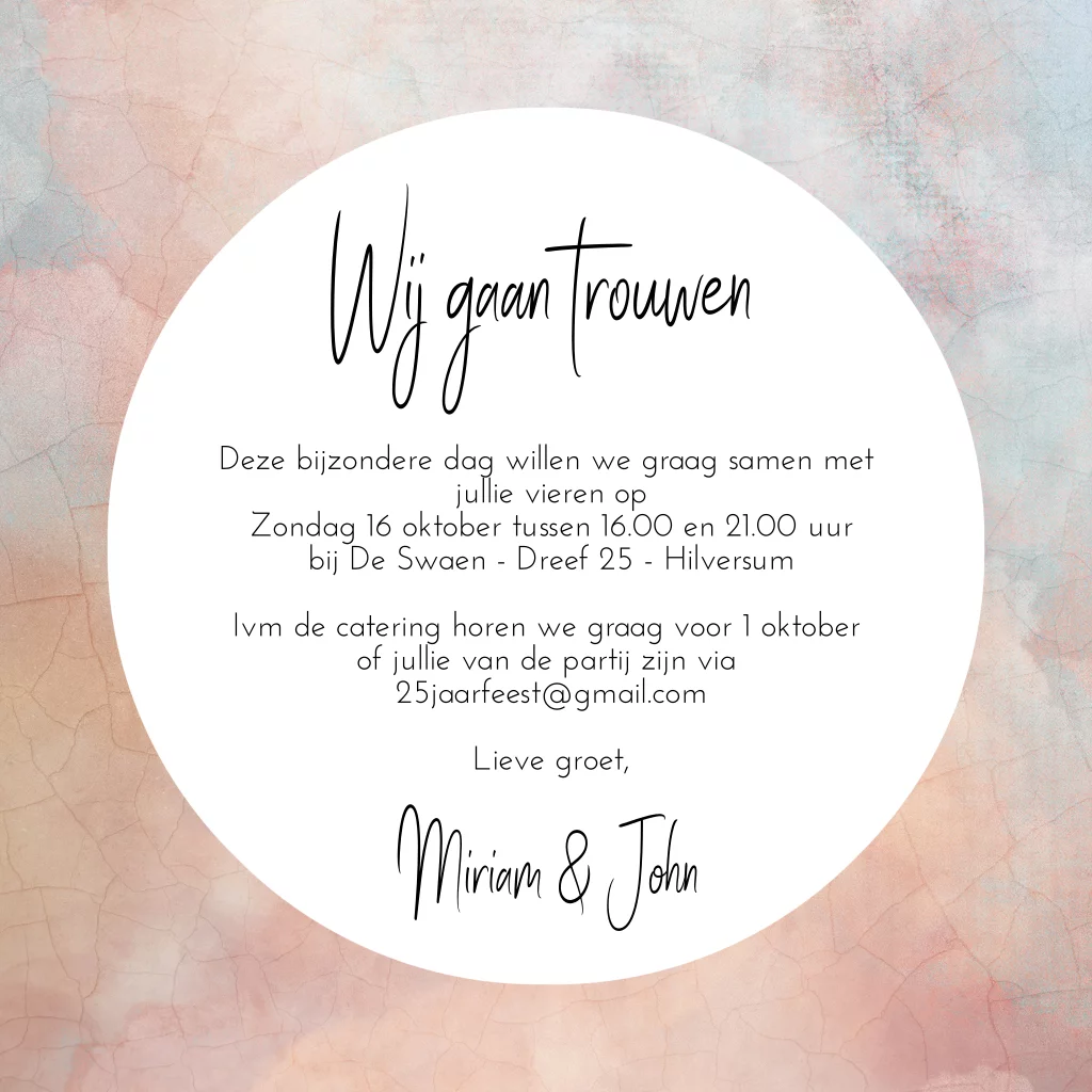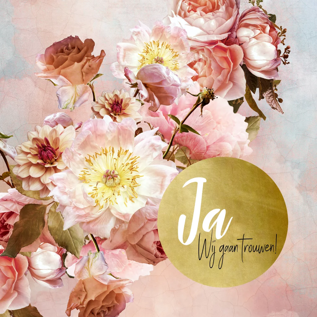 Prachtige trouwkaart uitnodiging met weelderige roze bloemen en goudlook gecombineerd. Met eigen foto binnenin. (21421)