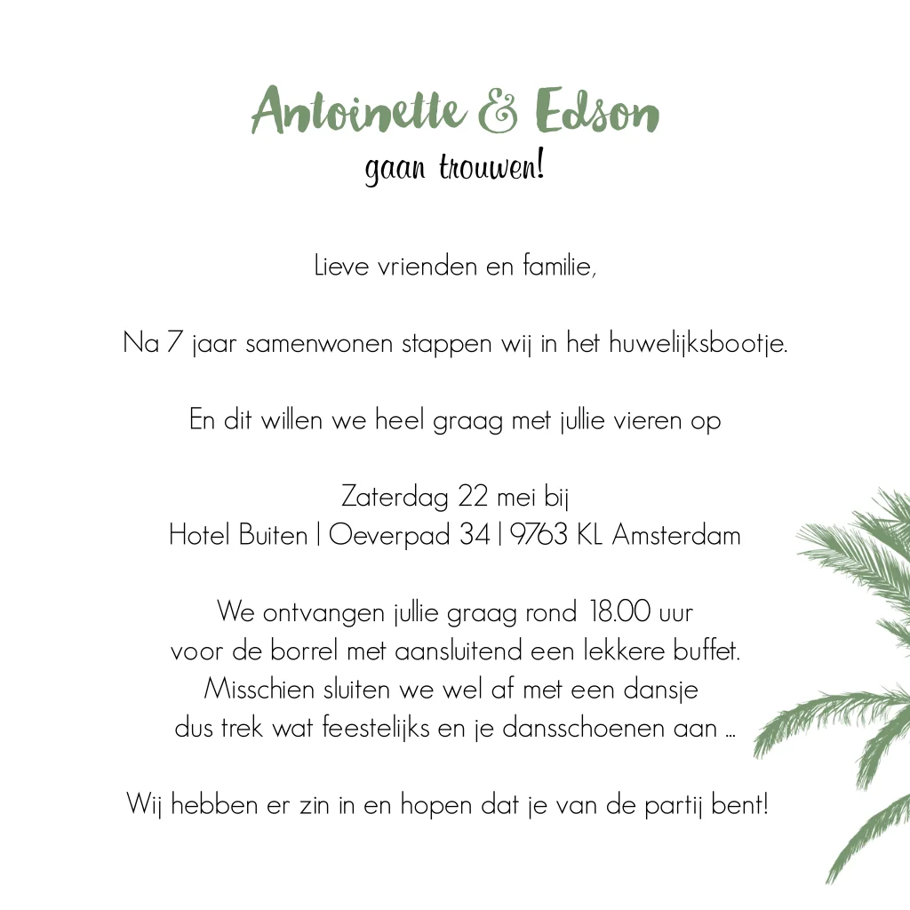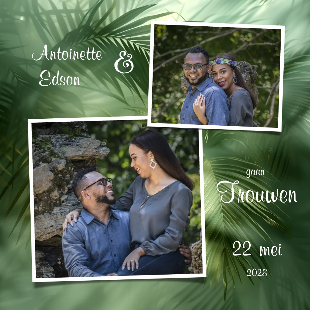 Prachtige trouwkaart met mooie groenen palmbladeren waar jullie eigen verliefde foto's mooi in uitkomen. In het groen met palmbomen (23869)