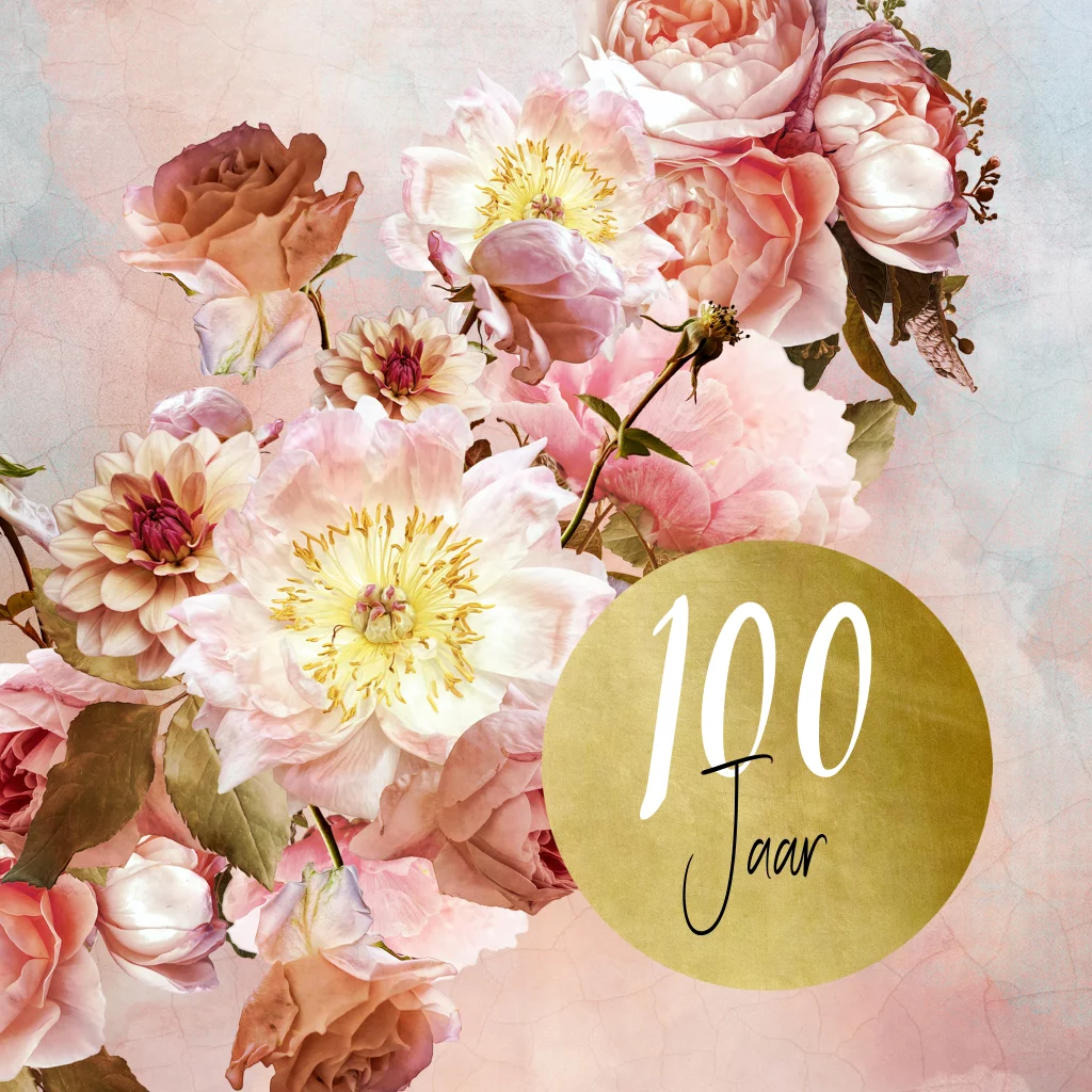 Prachtige 100 jaar verjaardagsuitnodiging met weelderige roze bloemen en goudlook gecombineerd. Met eigen foto binnenin. (21421)