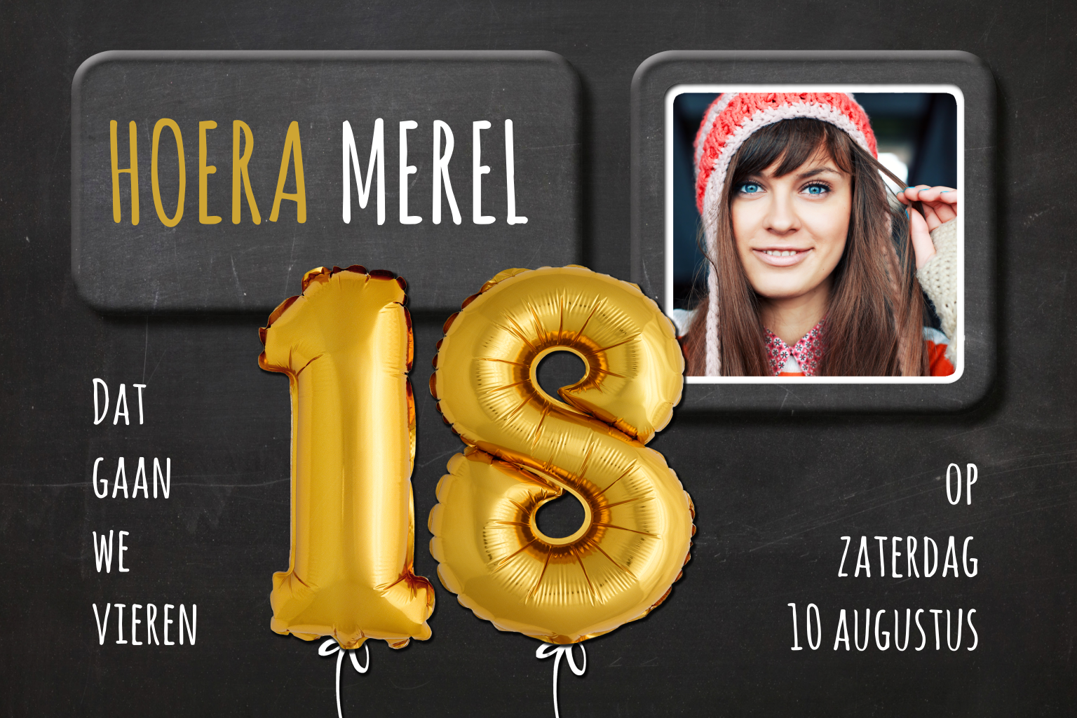 Uitnodiging 18 ballon goudkleurig op krijtbord