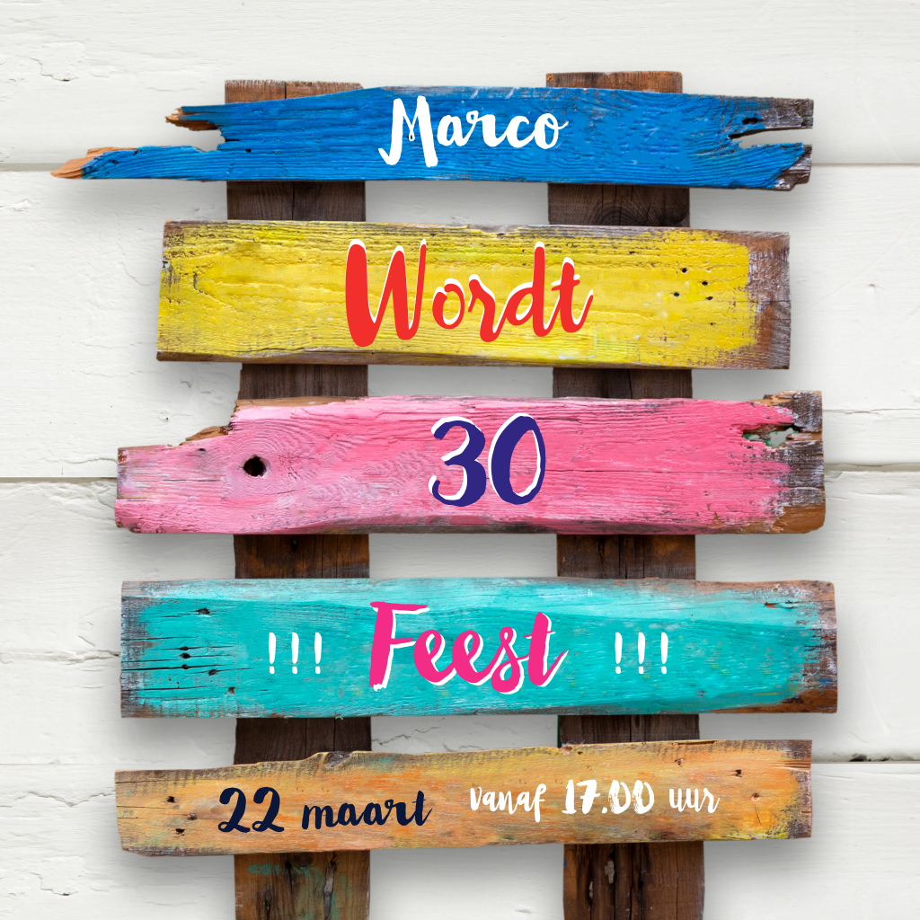 Uitnodiging 30e verjaardag gekleurde pallet hout
