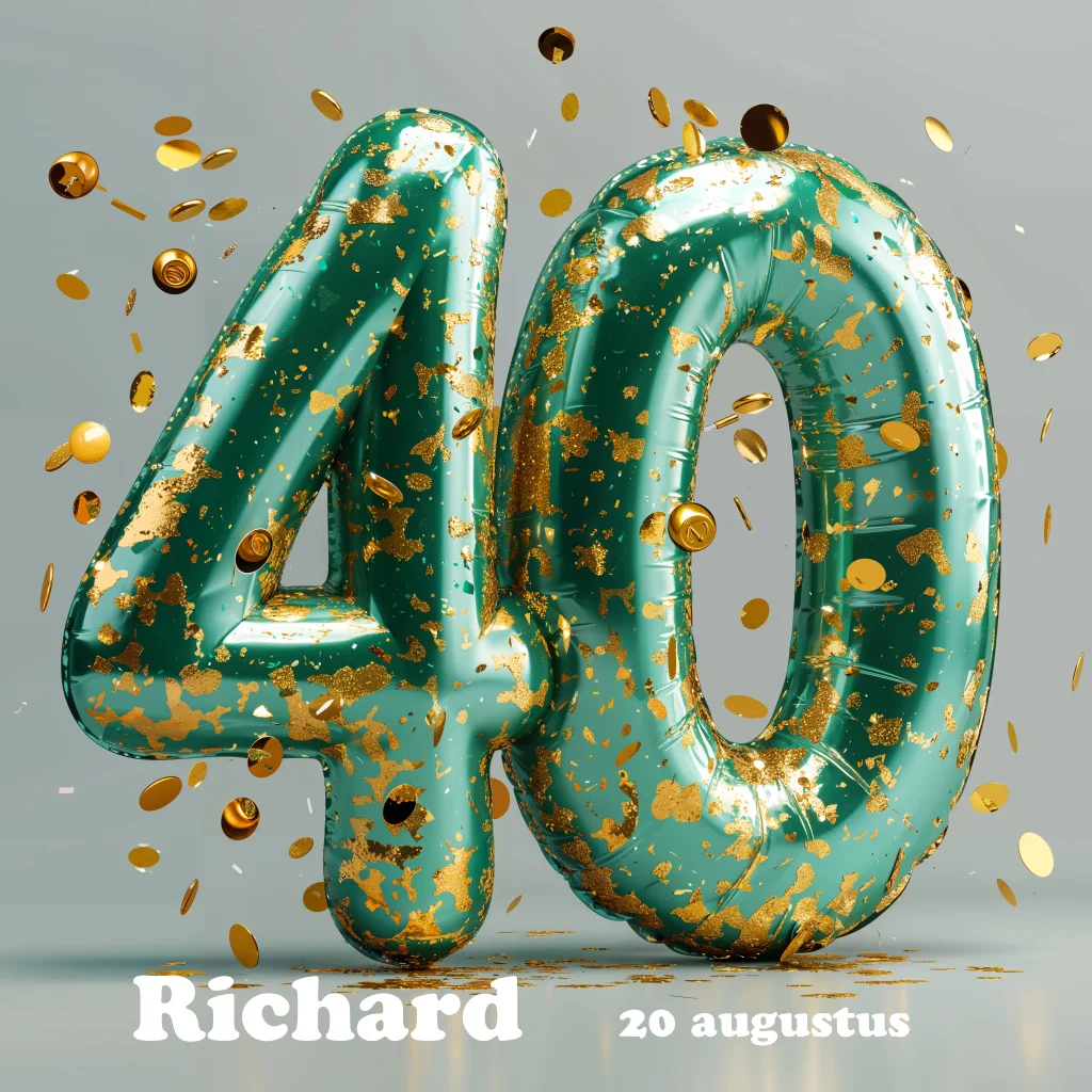 Uitnodiging 40 jaar met metallic ballonnen en confetti