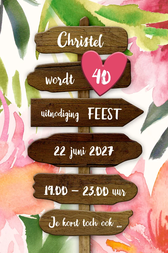 Vrolijke en hippe uitnodiging 40 jaar met een houten wegwijzer op geschilderde fleurige bloemen. Zo maak je van ieder partijtje een feest! (21455)