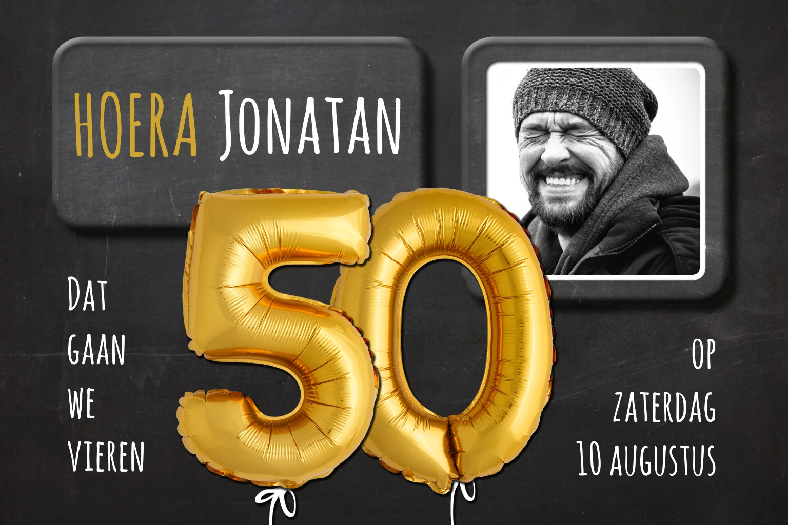 Uitnodiging 50 jaar man ballonnen goud krijtbord en eigen foto