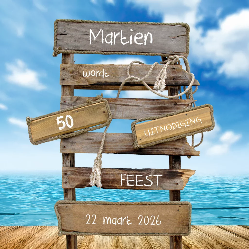 Een stoere houten pallet op een vlonder aan de rand van de zee. Super toffe uitnodiging voor het feest dat je wil gaan vieren! Aan de binnenzijde van de kaart is er ruimte voor het plaatsen van een foto. (24646)