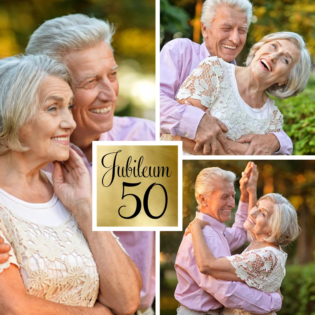 Uitnodiging 50 jarig jubileum fotocollage met goudlook schildje