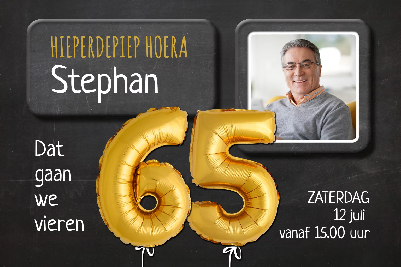 Stoere uitnodiging verjaardag met eigen foto en goudkleurige ballonnen 65. Op krijtbord achtergrond. (22343)