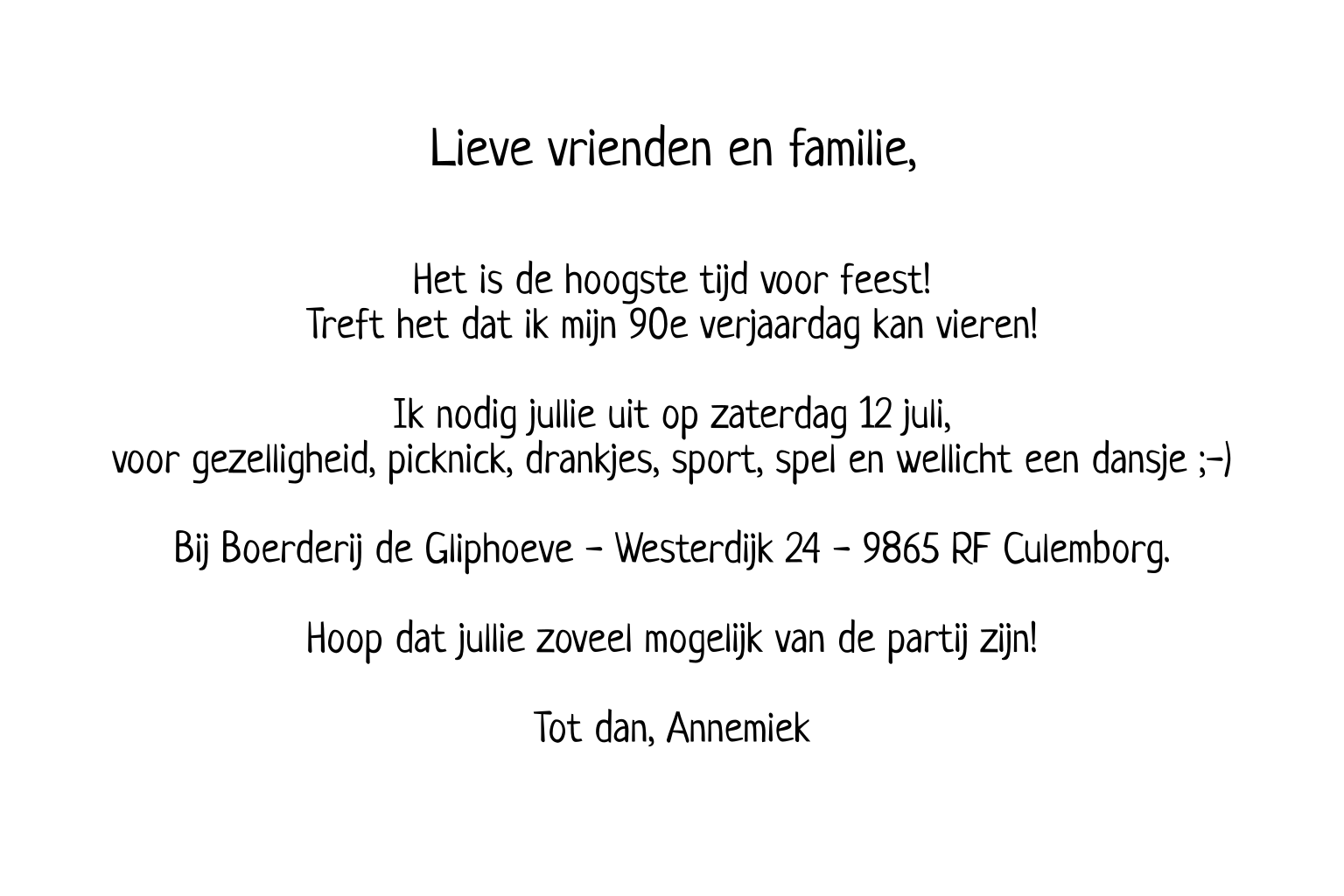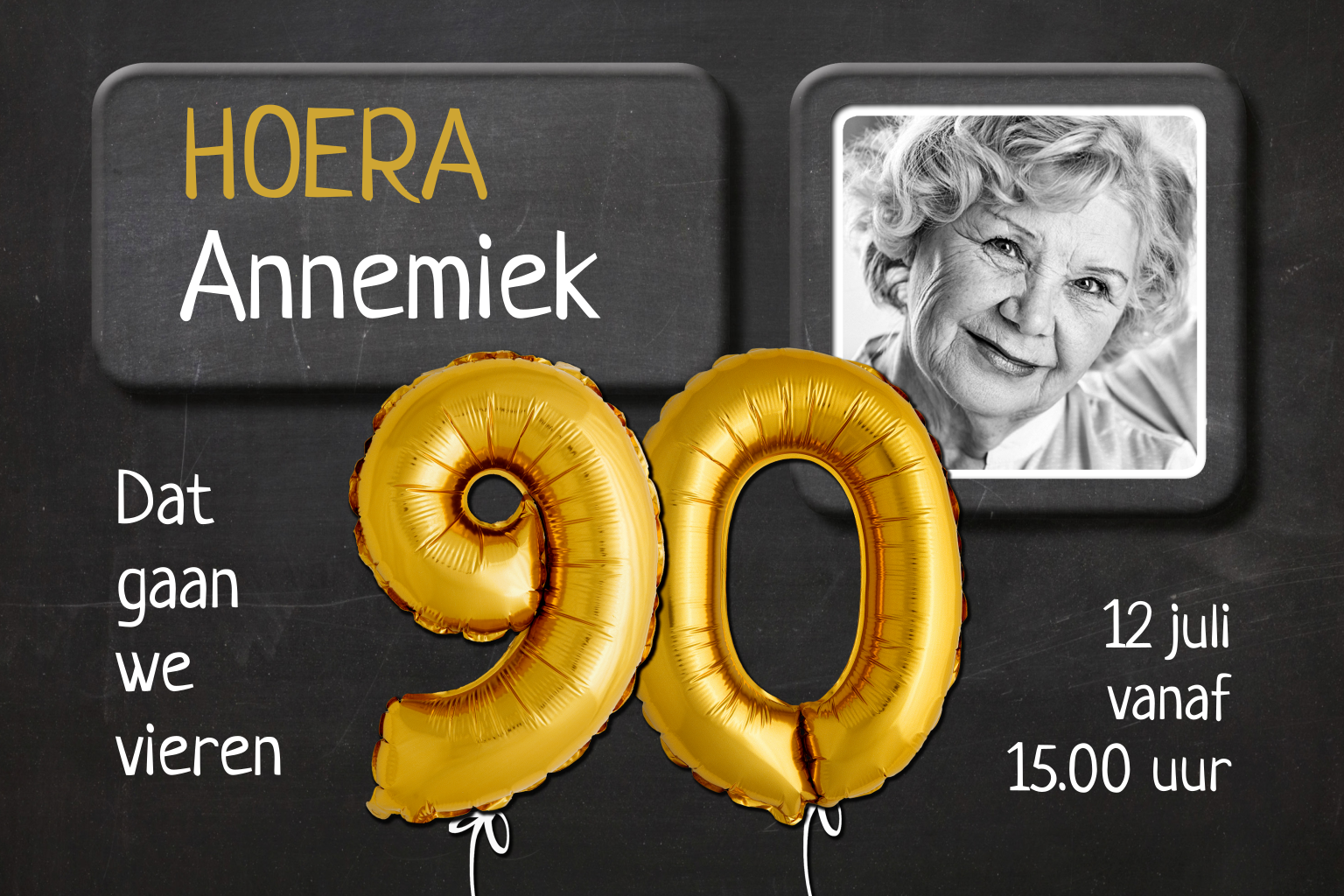 Gouden ballonnen voor de respectabele leeftijd van 90 jaar. Mooie krijtbord uitnodiging. (22701)