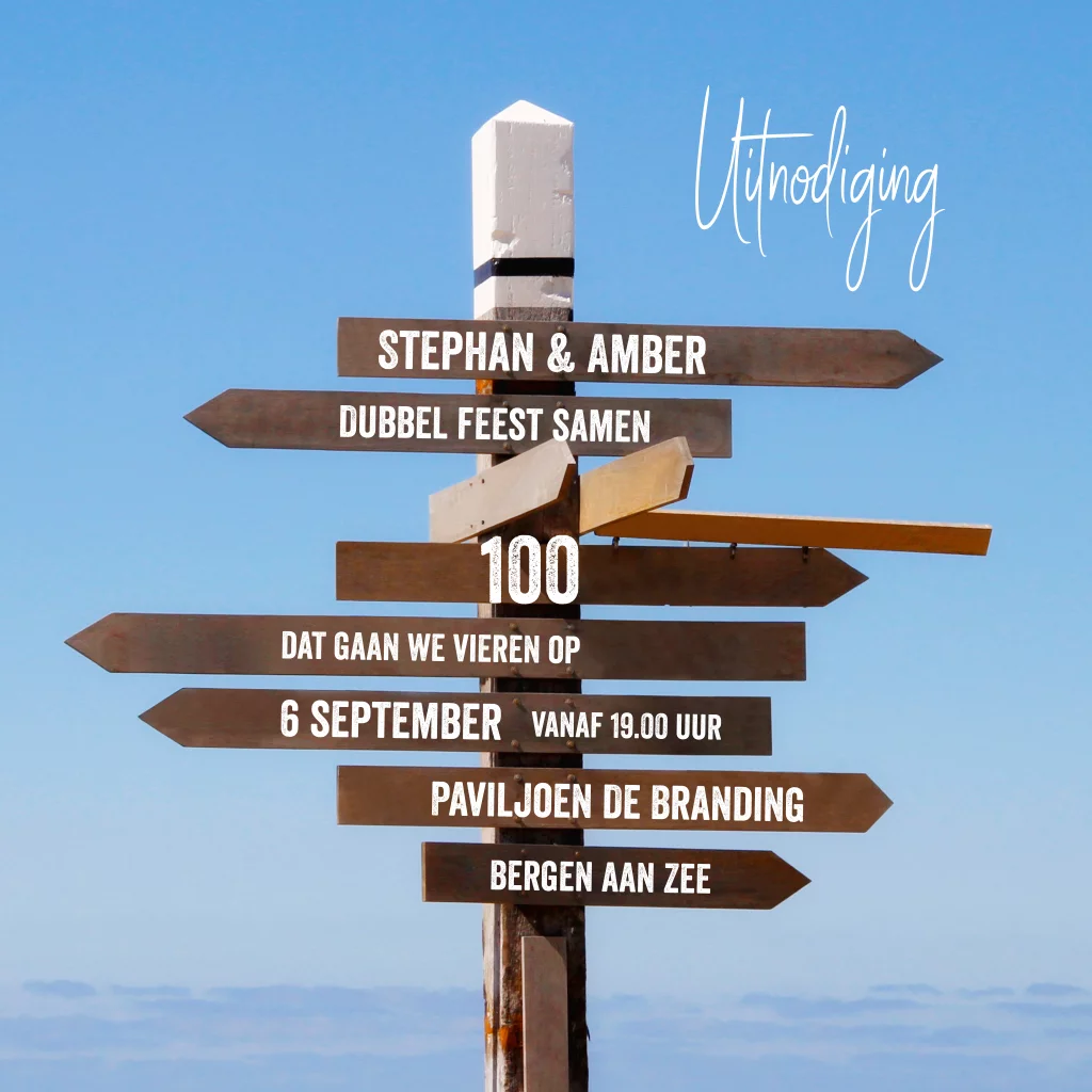 Uitnodiging samen 100 jaar. Met een houten wegwijzer. De teksten op de bordjes kunnen allemaal veranderd worden. (21437)