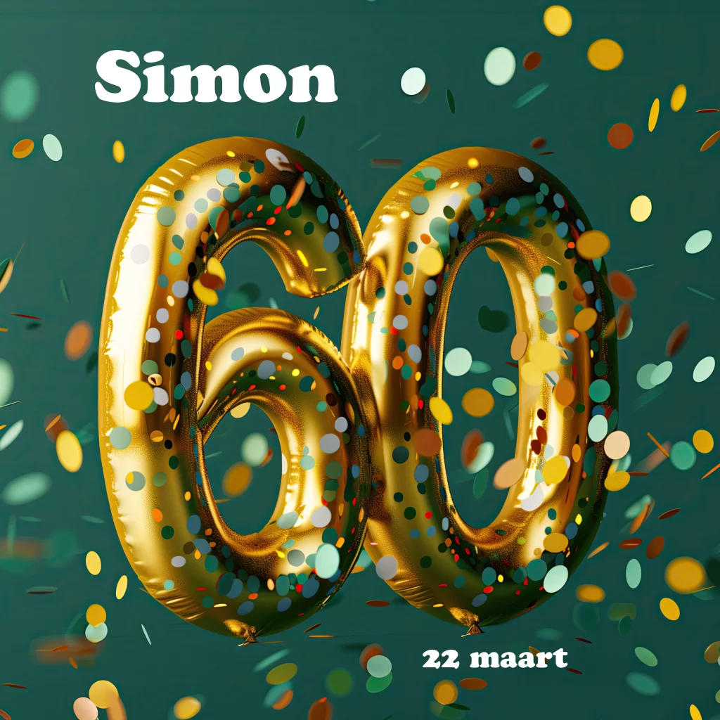 Vrolijke en feestelijke uitnodiging voor 60e verjaardag. Met metallic ballonnen en confetti. In groen gouden tinten. (23938)