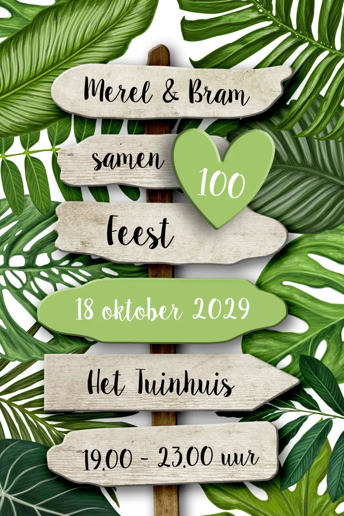 Hippe uitnodiging voor elk feest. Een wegwijzer van houten bordjes en veel botanisch blad. Alle teksten zijn aan te passen en binnen is ruimte voor je eigen foto. (21423)