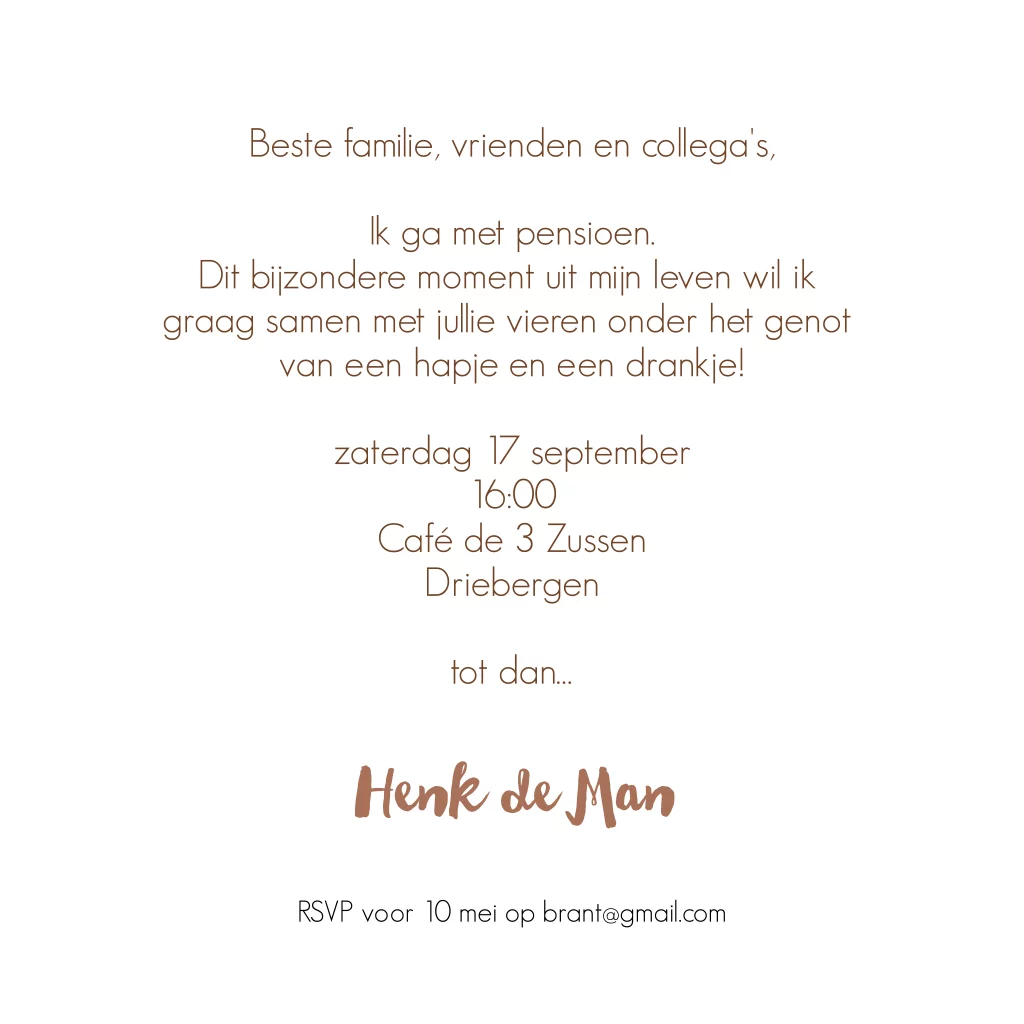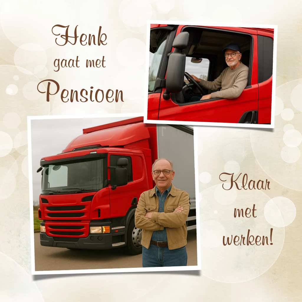 Uitnodiging feestje pensioen fotocollage van een man met foto vrachtwagen. Plaats 3 mooie foto's en pas de teksten aan. (23501)