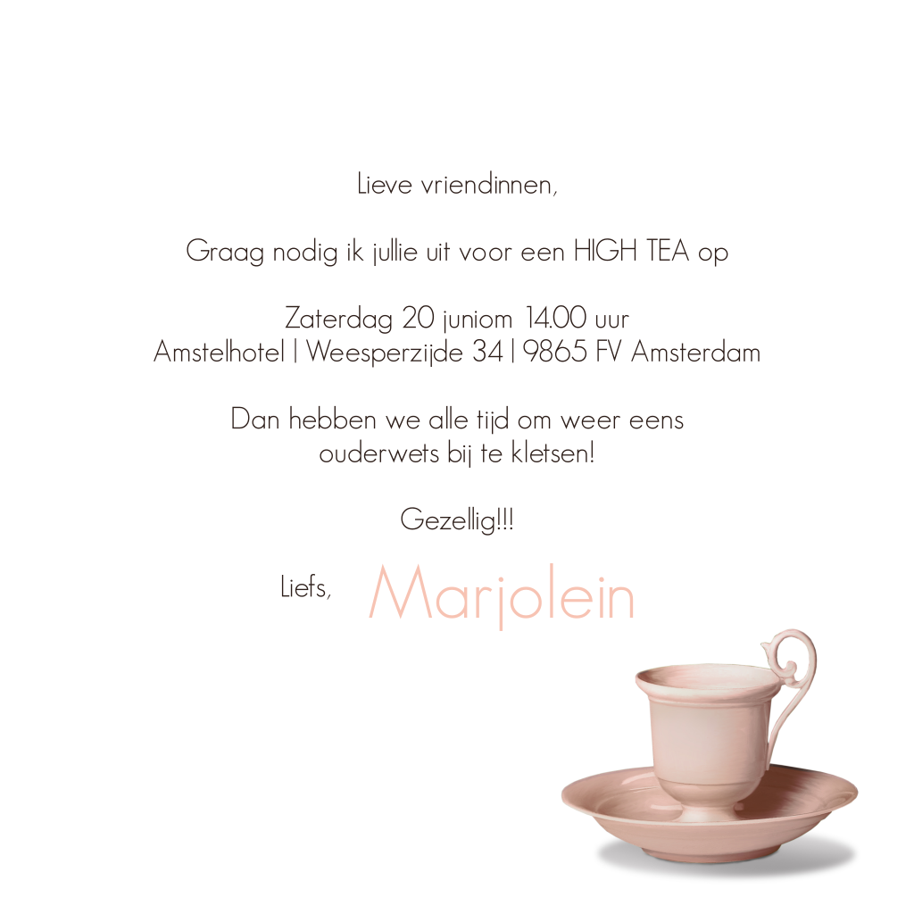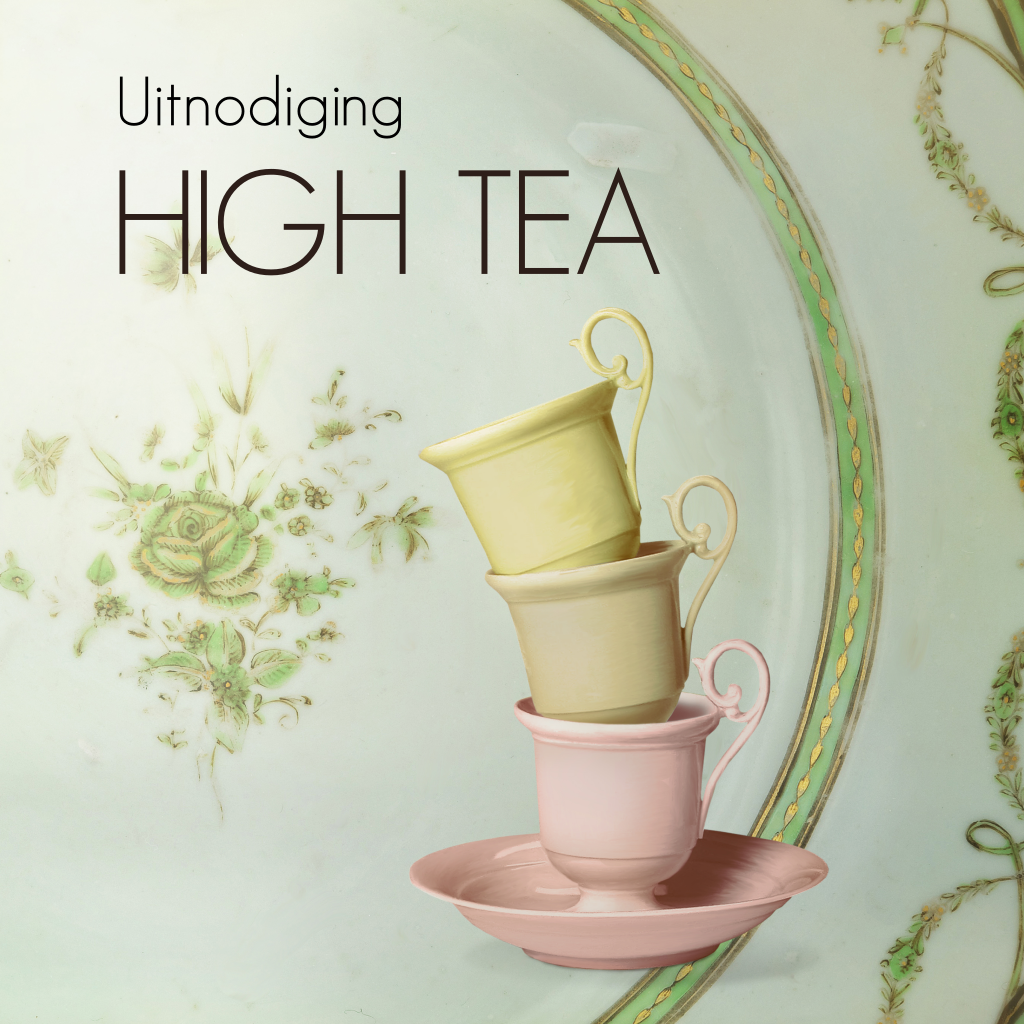 Prachtige uitnodiging High Tea met porseleinen bordje en stapel theekopjes. In pasteltinten. (23245)