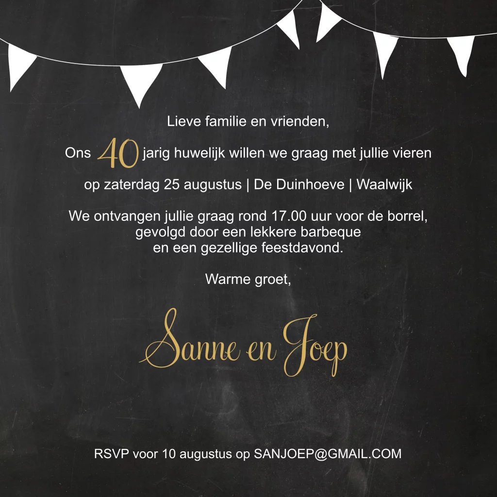 Leuke uitnodiging 40 jarig huwelijk met je eigen fotocollage en goudkleurige ballonnen 40 op krijtbordlook achtergrond. (22136)