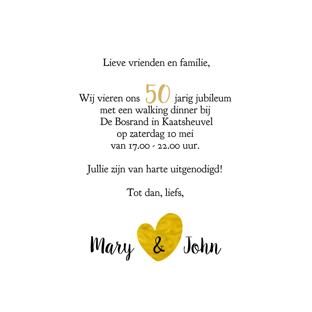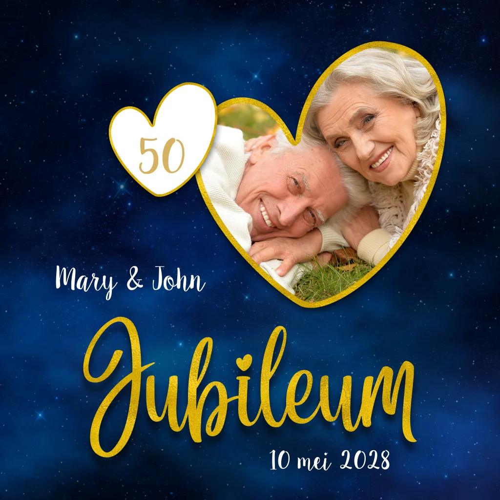 Prachtige uitnodiging jubileum 50 jaar getrouwd. Met hart fotoframe en achtergrond van blauwe sterrenhemel. Alle teksten zijn aan te passen. (22021)
