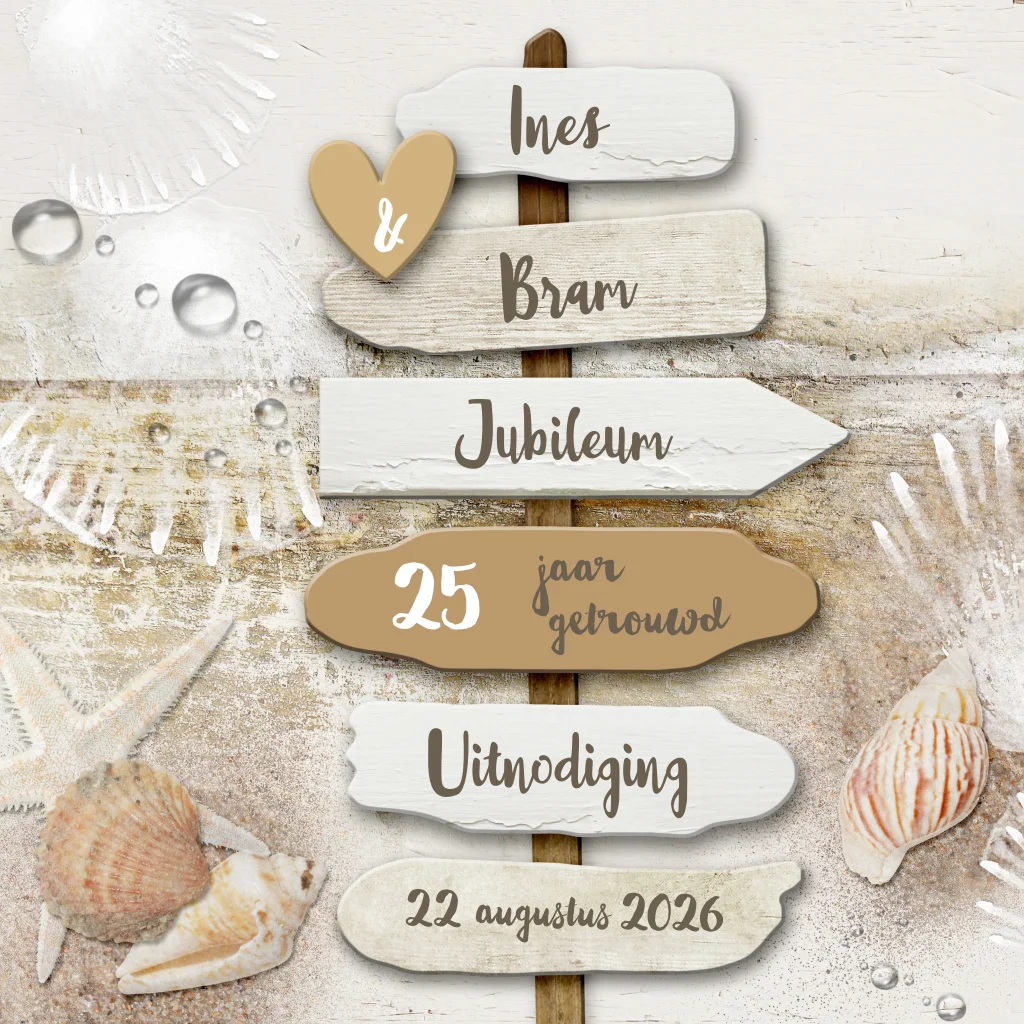 Uitnodiging jubileum 25 jaar getrouwd houten bordjes strand